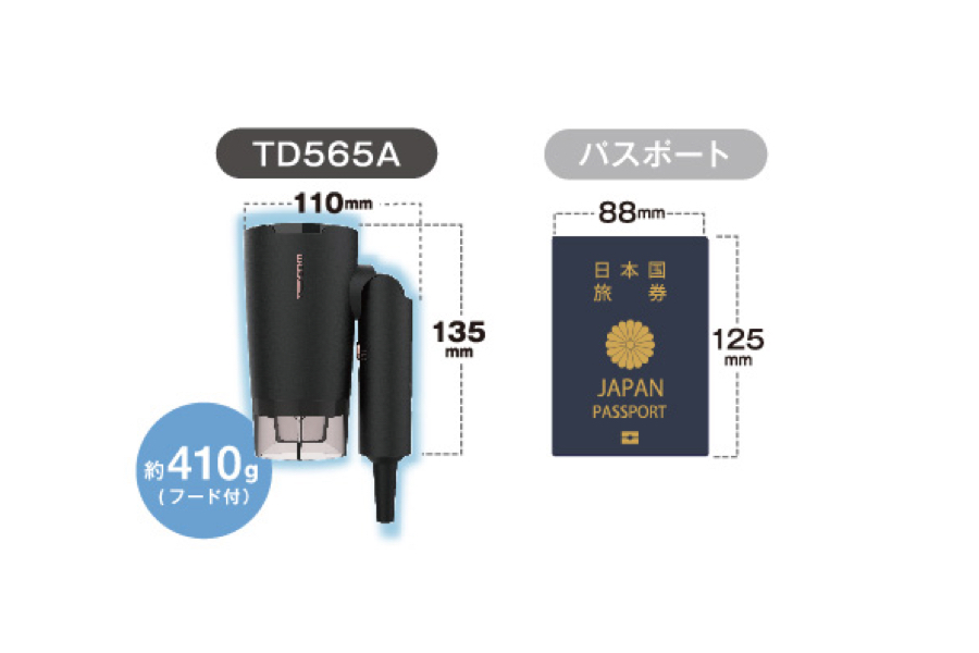 そんな支障を解消する、テスコム「マイナスイオン ヘアドライヤー TD565A」は、コインで簡単に電圧切替(※1)が可能で軽量・コンパクトサイズ、そして多くの国で採用されているCタイプのコンセントに対応するCタイプ変換プラグ(※2)が付属し、国内でも海外でも、いつものドライヤーを使用することができる。また、髪の広がる一因となる静電気を抑制するマイナスイオン搭載で、旅先でもまとまりのある髪へと導く。