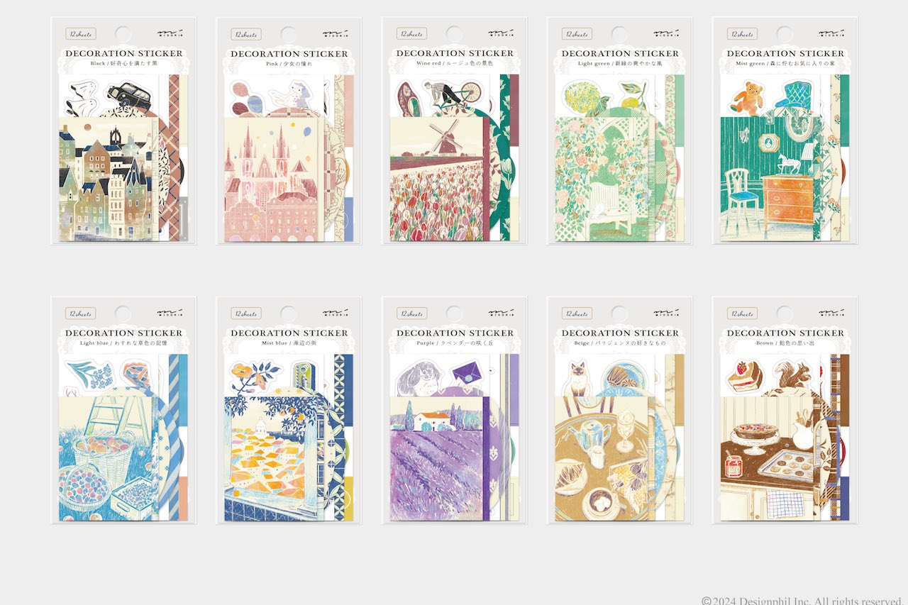 イラストレーター「たかまる ゆうか」さんが描く、懐かしさを感じる優しいデザインを詰め合わせた。「ヨーロピアンヴィンテージ」をテーマに、絵本の挿絵を思わせるレトロな雰囲気の全10柄から選ぶことができる。たっぷりと使える12シート入りで、ページを自由にアレンジすることはもちろん、透明なスマートフォンケースに挟んで、手帳やノートとお揃いでお気に入りのデザインを楽しむのもおすすめ。