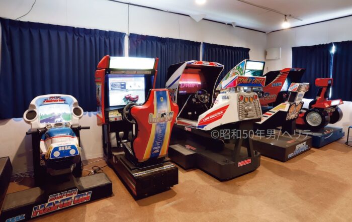 倉庫の一角に作られたゲーム部屋には、テーブルゲームや体感ゲームがズラリと並び、ゲームタイトルのポスターが貼られていて、この空間はまさに昭和のゲーセンそのもの。あの頃の記憶がフラッシュバックするのと同時に、懐かしさと興奮の感情が湧き上がってくる。