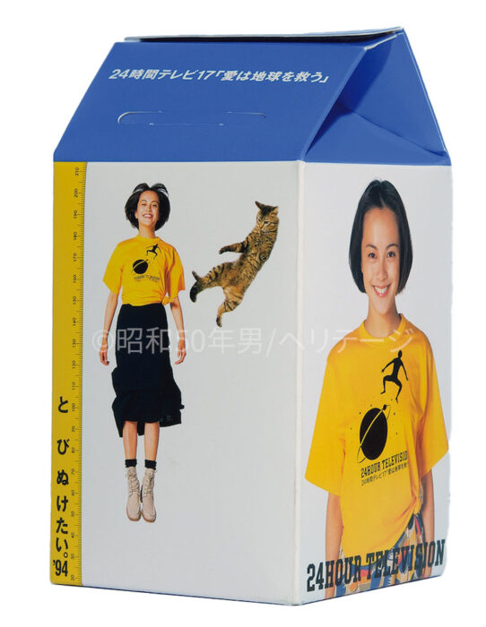 1994年にチャリティーパーソナリティーを務めた『24時間テレビ』の募金貯金箱。定規としての目盛りもついていたりして 実用性(?)も狙っている。牧瀬里穂が猫と飛び跳ねる構図がなんともかわいい。荒魂価格1,500円