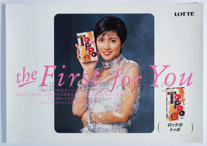 アイドルとして人気絶頂のなか、起用されたロッテ「トッポ」の電車用中吊り広告。当時は防犯カメラなども少なかったため、中吊り広告などは一瞬で持ち去られることが多かったとか。荒魂価格1,000円