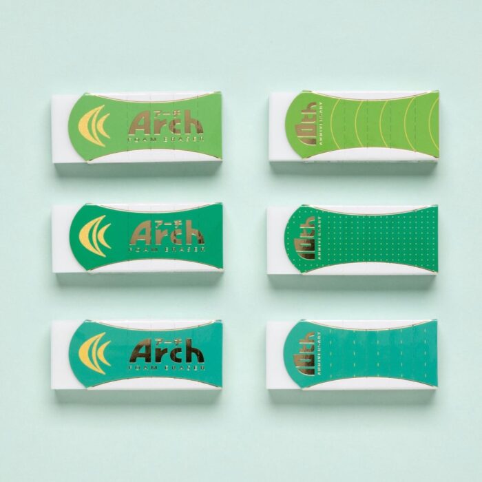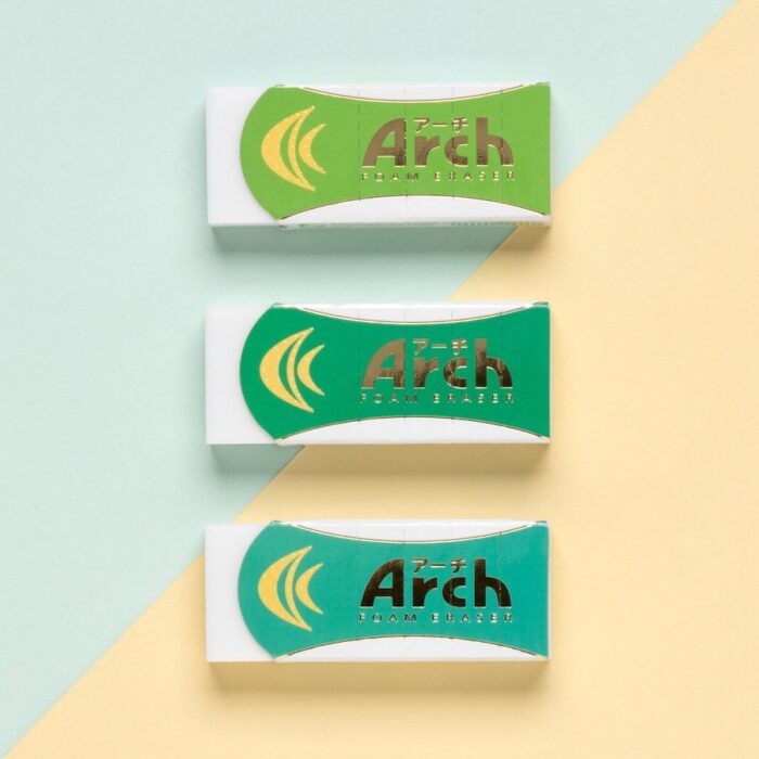 「アーチ消しゴム」は、ケースを曲線(アーチ)状にすることで、生地の食い込みを劇的に軽減した消しゴムだ。また、プラスチック生地に特殊発泡体(メラミンフォーム)を入れており、従来のプラスチック消しゴムよりも、①よく消える ②軽い力で消せる ③消しクズがまとまる ④コシがあって折れにくい ⑤消しゴムが汚れにくいといった、総合的に優れた特長を持ち合わせている。