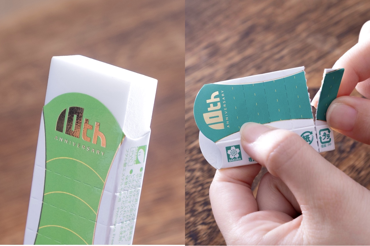 そのほか、スリーブにグリップが付いているため、すべりにくく、軽い力で消すことができる。今回は発売10周年を記念し、金の箔押しと10周年ロゴを取り入れた限定デザイン3種を取り揃えた。