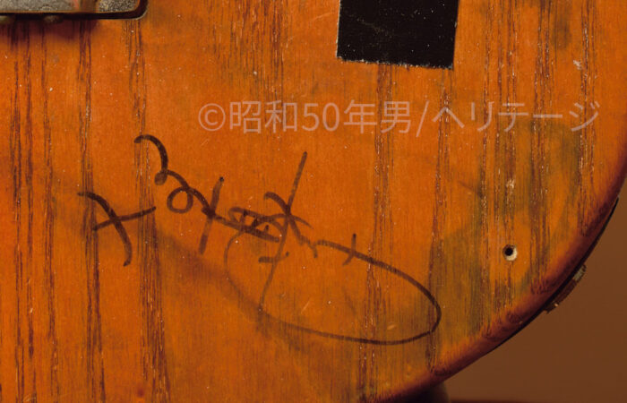 やや小ぶりで、薄めのボディが特徴。「1990年から使ってきて、世界中いろんな所へ持っていきましたね 。ボディの後ろには猿岩石の二人のサインが入っていますが、少し薄れてきちゃいました」