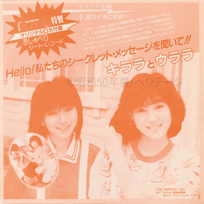 今なお好事家に人気のテクノ歌謡系アイドルデュオの自己紹介トーク入り雑誌付録ソノシート。事務所的にももクロの超先輩です。