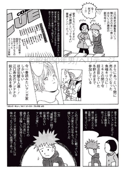 イースト・プレスから1994年に登場した『COMIC CUE』。毎号ひとつのテーマについて、魚喃キリコ、冬野さほといった新鋭作家をはじめ、錚々たる面々が執筆。マンガ家の枠を越えたカルチャースター・江口寿史のセレクト盤といった趣のマンガだった。