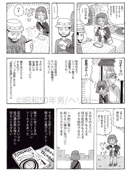 直角の体験が生きた「渋谷のセレクトショップにフライヤーとフリーペーパーを置いてもらう」の図。なんでかわからないけど、渋谷のお店の店員はとにかくぶっきらぼうでこわかった印象がぬぐえない 。だからこそ特別感があったし、そこに通うことがステイタスとして機能していた感もある。