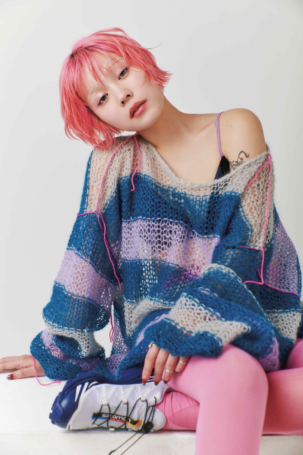 「ライン感というより、全体的に切り込んだ、ザクザクとした質感が気になります。カラーもハイトーンの一色で仕上げるのではなく、より遊び心を効かせたデザインに。今回はレイヤーに合わせて、ポイントでブリーチしてオンカラー。レイヤーで軽さと動きを出すことで、ポイントカラーがよりラフに生きてきます」(神谷さん)