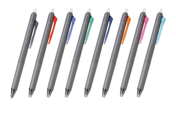『フリクションシナジーノック』は、ビジネスシーンでの手帳やメモ、ノートなどへの細かな文字やデザインの描画に最適で、細書きユーザーになめらかな筆記と消せる便利さを提供する。ボディカラーをグレーで統一しており、クリップの色でインキ色を表現。落ち着いたデザインでありながら、先進的な印象と都会的なスタイリッシュさを演出した。