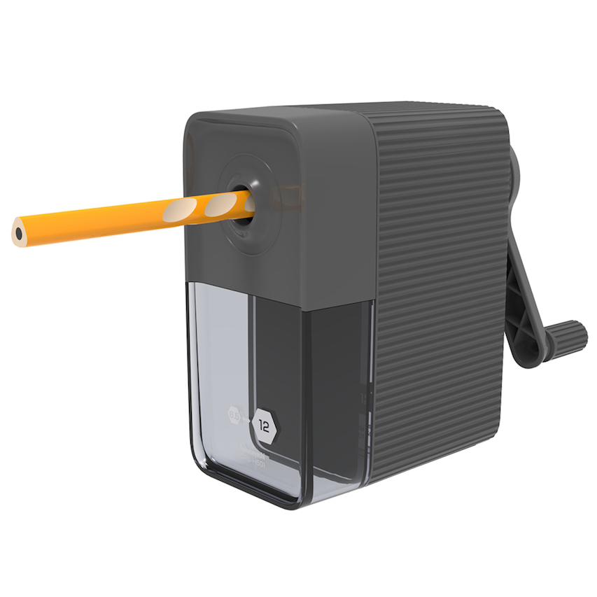 「太い鉛筆も削れる手動鉛筆削り」は、一般的な直径8mmの鉛筆に加えて、直径6.5mmの細い鉛筆から直径12mmまでの太い鉛筆(六角・丸・三角)にも対応したハンドル式の手動鉛筆削り。専用の鉛筆削りが必要だった三角軸の太いこども用鉛筆もこの一台でサクサク削ル事ができる。