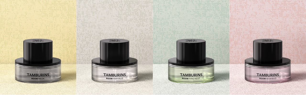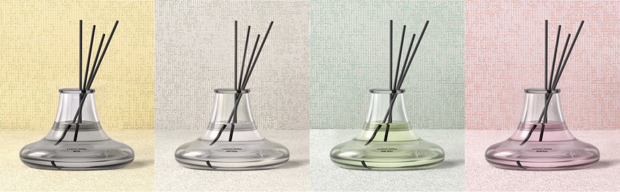 硯の上でゆっくりと墨を磨る香りを連想させる「MEOK」、雨上がりの軒先にできるしずくをイメージした「PINE NEST」、柔らかな色合いの白い紙をイメージした「PAPYRUS」と晩秋の寒さの中でたくましく咲く菊をイメージした「MUM BUD」の4つの香りは、「ROOM SPRAY(ルームスプレー)」と「DIFFUSER(ディフューザー)」で展開される。