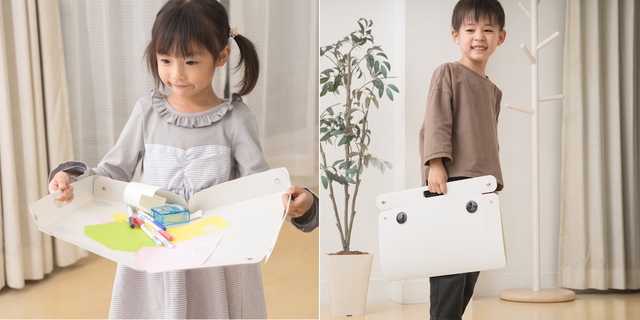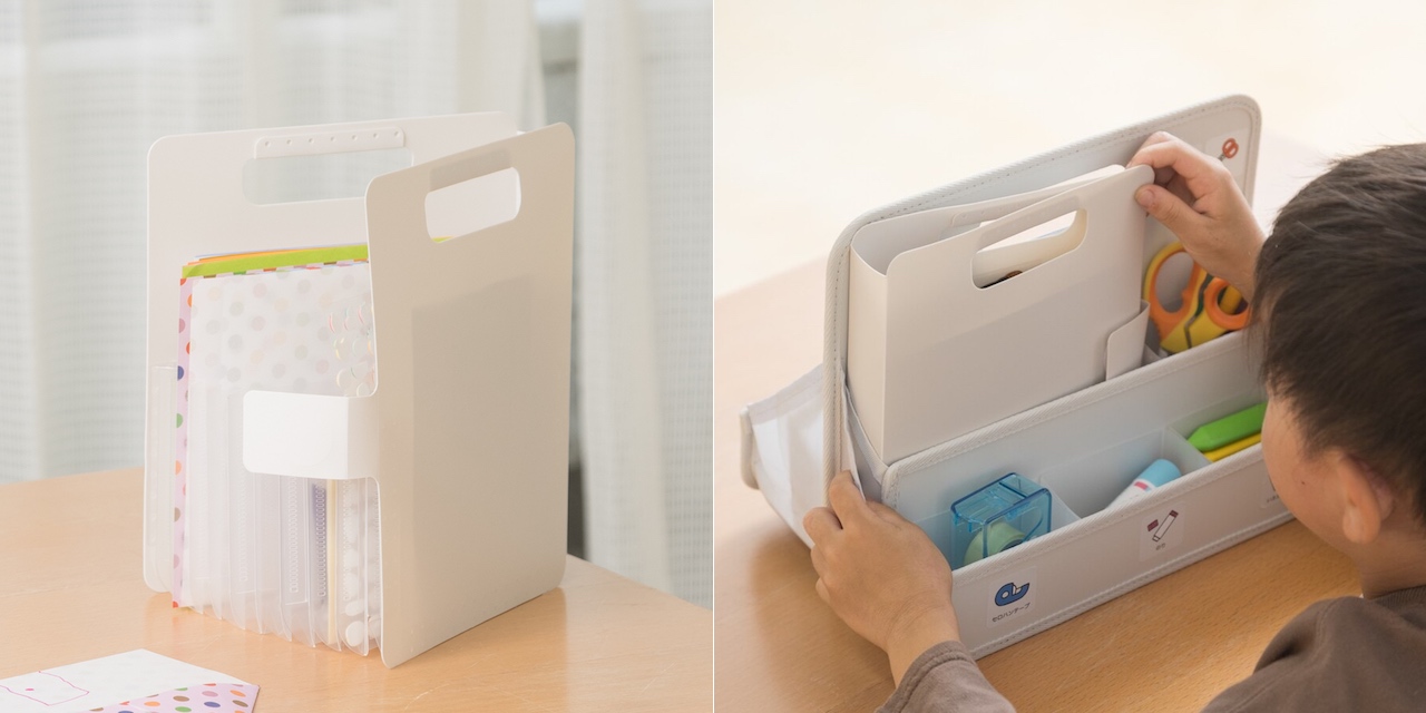 描画材や遊び道具が散らからないガード付きの「おえかき学習トレー」は保護マット付きで絵や文字をかくときに滑りにくく書きやすく工夫した。「こまごまファイル」は蛇腹形状なのでワンアクションで中身を取り出すことができ、収納しやすい幅広サイズのポケットとなっている。