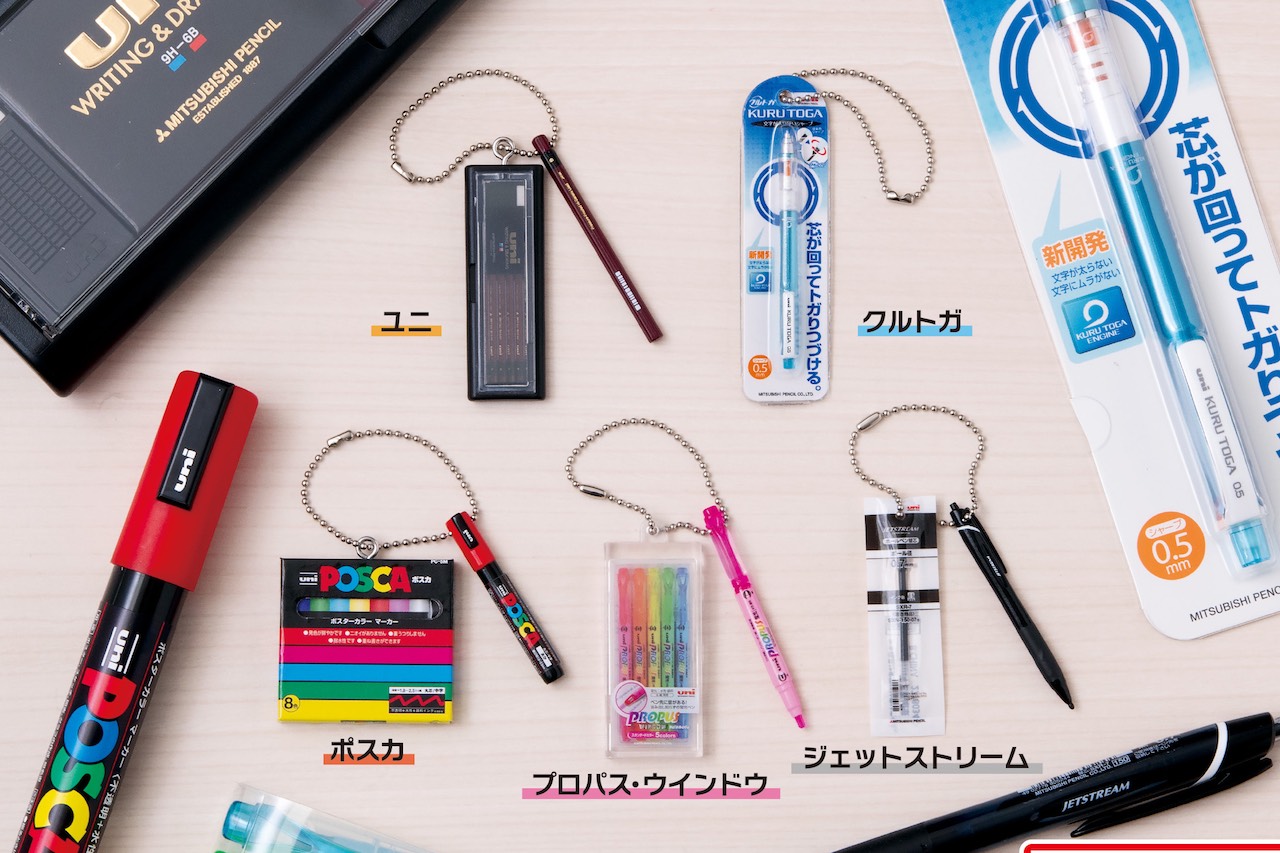 本商品は、三菱鉛筆の人気文房具のミニチュアチャーム。ラインナップは、なめらかな書き味の鉛筆「ユニ」、芯が回ってトガりつづけるシャープ「クルトガ」、鮮やか発色の水性サインペン「ポスカ」、ペン先に窓がある!はみ出し知らずの蛍光ペン「プロパス・ウインドウ」、‟クセになる、なめらかな書き味。”のボールペン「ジェットストリーム」の全5種。「クルトガ」はブリスターパッケージ入り、「ジェットストリーム」はパウチにインクの替芯が入っている仕様で、全高約3.5~7㎝のミニチュアサイズながらパッケージまでしっかり再現している。