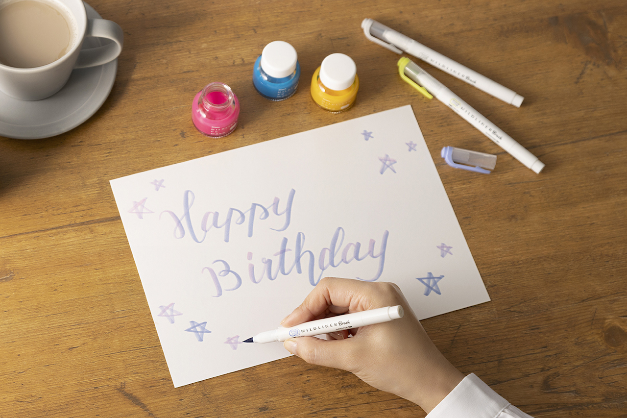 近年女性を中心に万年筆のインクを集める人が多く、「#インク沼」という言葉はInstagramで18万件以上投稿されている(※2)。値段が高く扱いが難しい万年筆ではなく、だれでも気軽に使えるマーカーとインクの色の間で生まれるグラデーションが描けることが「マイルドライナーのもと」の新しい点だろう。描くたびに色の変化が異なるアナログならではの楽しさを感じながら、手帳を彩る用途や、心を込めたバースデーカードの文字書きに使用することで、自分だけの表現が可能となる。