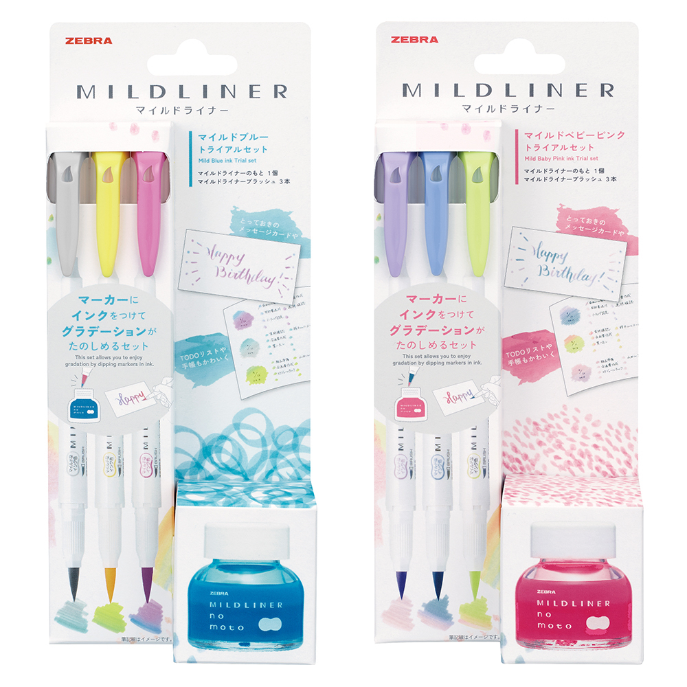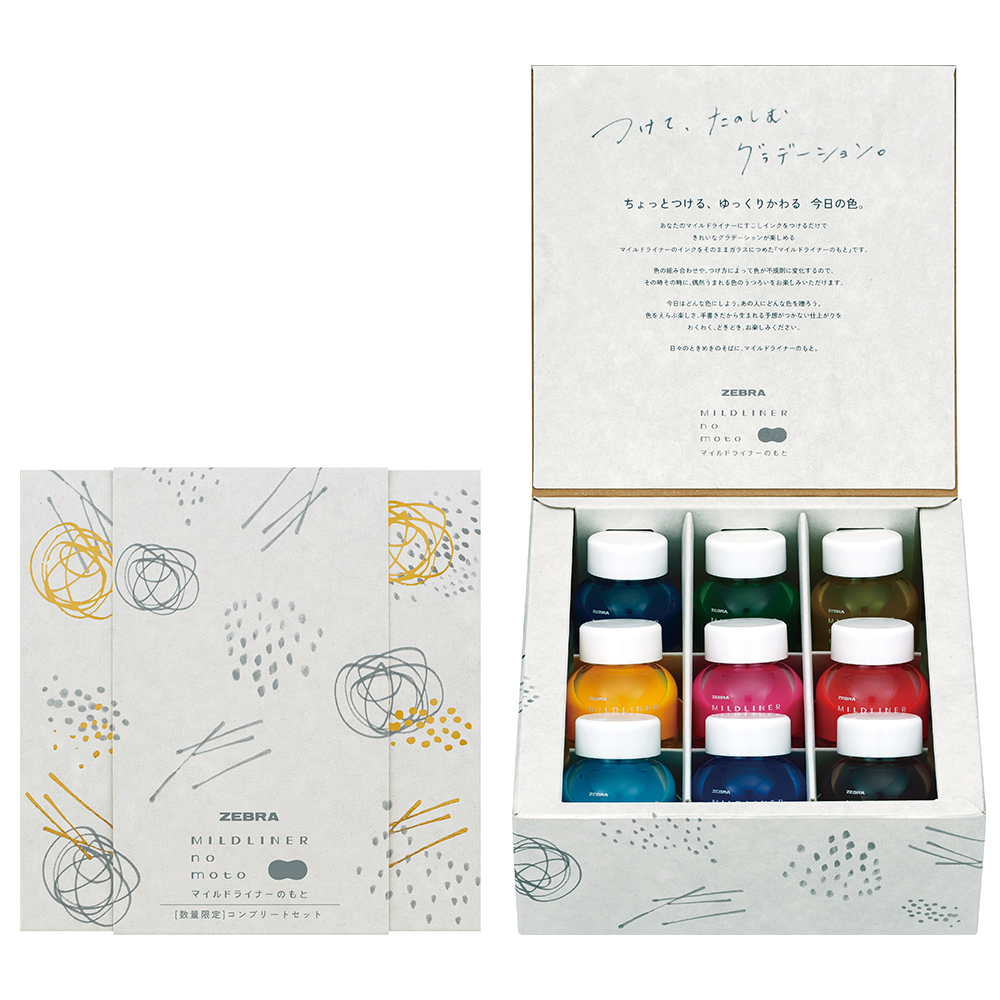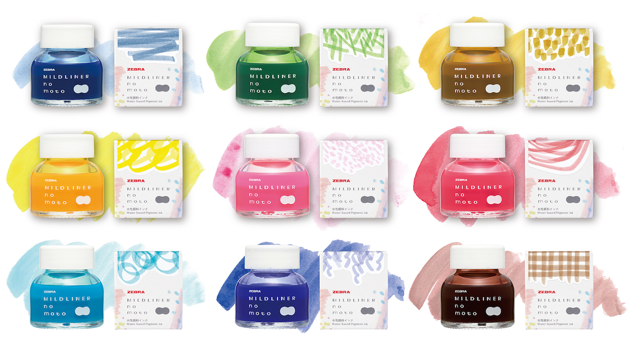 ゼブラは、これまでマッキーやサラサなどの筆記具を製造販売していたが、このたび初めてペンで使われているインクを販売する。今回販売するインクは、おだやかな色合いが人気のラインマーカー「マイルドライナー」のインクだ。ペンと違う色のインクにペン先を直接つけることで、全部で306通り(※1)のグラデーションが生まれ、自分だけの表現を楽しむことができる。