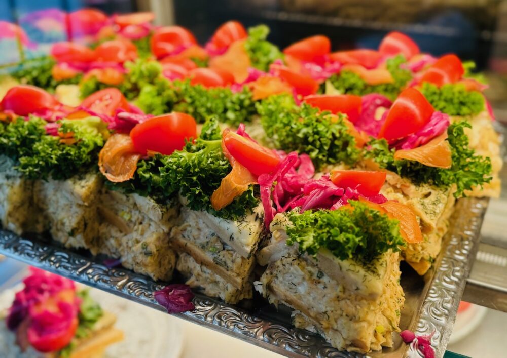 甘いものよりもがっつりと食事をしたい方には、ここ数年前から大人気のスモーガストルタがおすすめ。サンドイッチケーキみたいなイメージですね。