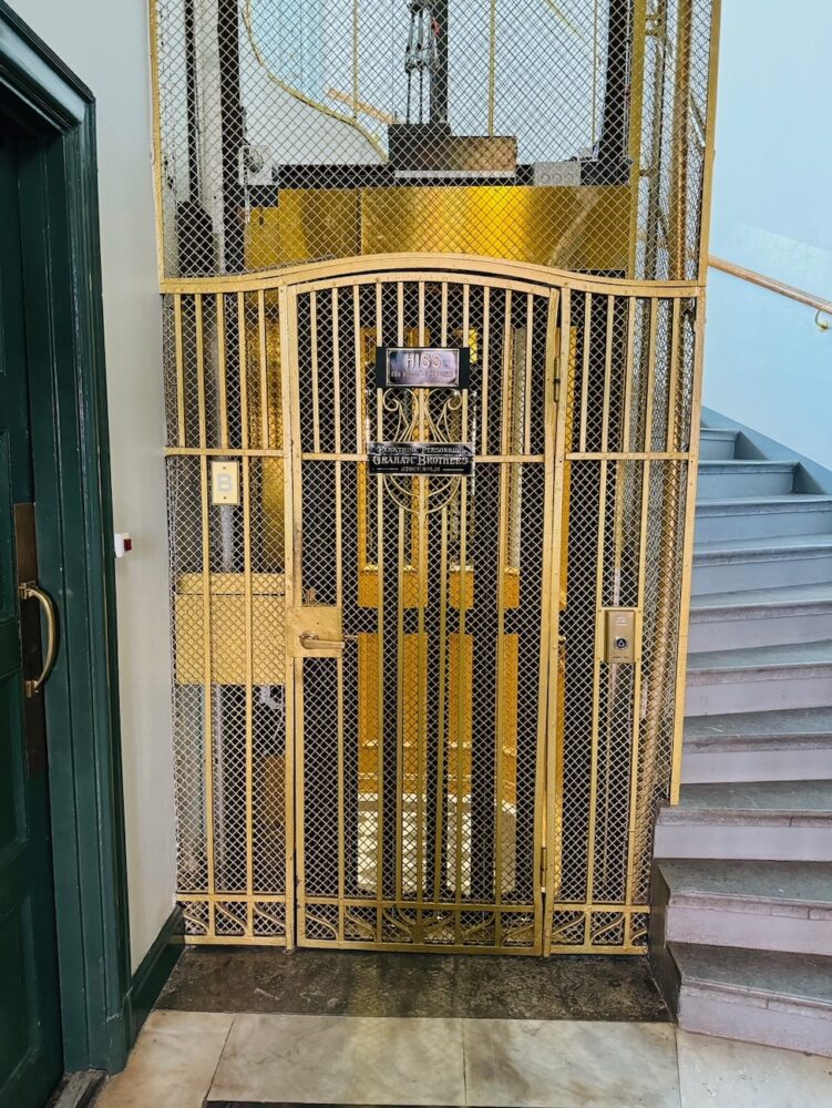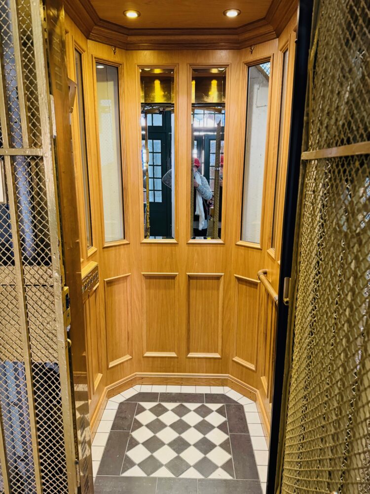 二重扉でもちろん手動。でも、安全性は抜群。ちょっと動きが遅いだけ。動き出す時と止まる時は動きが激しいと、何かが矛盾してますが、愛すべきエレベーター。