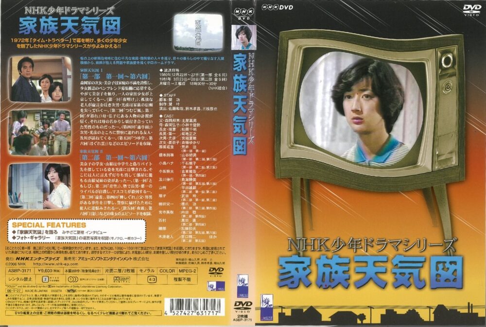 『家族天気図』の内容は、先ほど分類した中のホームドラマのカテゴリーに属する。新興住宅地に暮らす4人家族の平凡な日常生活のなかに起こる些細な事件から家族の問題をあぶりだし、絆を確認すると言う、この時代によく観られたものだが、山田太一や向田邦子の作品ほどの強烈なメッセージはなく、ターゲットである小学生・中学生には届くかもという、本当にありそうな出来事を膨らませていく物語展開が絶妙であった。夫婦役の土屋嘉男と小林千登勢の確実な演技が、子役を含めたキャリアの浅い役者たち支えていた。デビュー間もないころの松原千明が観られることでも貴重。
