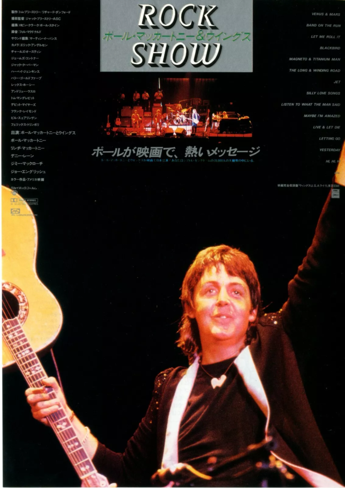 ほどなく上映開始。フィルムコンサートでは何度かポールの映像を観てきたが、ロードショーでポールの映像を観るのは初めてのこと。公会堂ではなく、映画館という雰囲気に心が高鳴った。しかしながら当時はウイングスの曲は『グレイテスト』を通じてのヒット曲くらいしか知らず、この映画のサントラ的役割の3枚組ライブアルバム『ウイングス・オーバー・アメリカ』はまだ聴いたことがなかった。したがって目当てはビートルズの曲。『カンボジア難民救済コンサート』で聴いた「レット・イット・ビー」のような新鮮なアレンジのビートルズナンバーが聞けるのかも、という期待が大きかった。『ロックショウ』で演奏されたビートルズナンバーは5曲。「ザ・ロング・アンド・ワインディング・ロード」「夢の人」など、目新しいアレンジもあったが、実際にはウイングスの曲が響いた。ポップでありロックであり、ショウであるというアレンジ、演奏、演出に興奮し、ポールのルックスやしぐさ、シャウトに感動させられた。いつか、ポールのコンサートを見たいと思ったのは言うまでもない。
