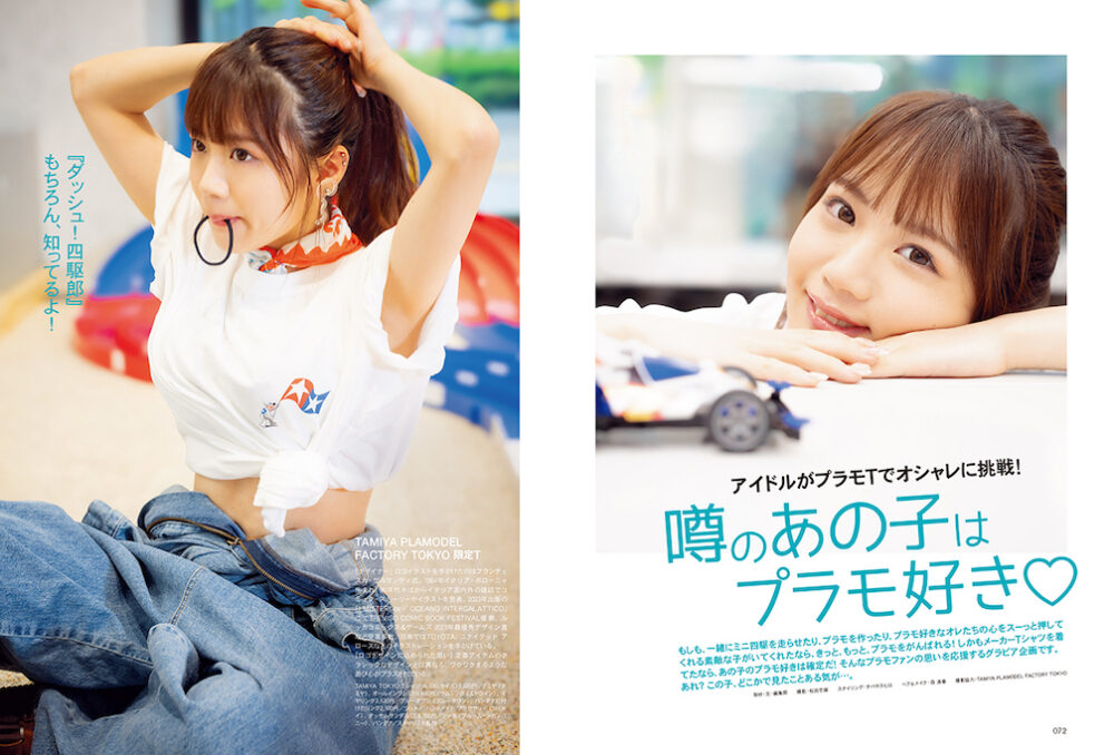 もしも、一緒にミニ四駆を走らせたり、プラモを作ったり、プラモ好きなオレたちの心をスーっと押してくれる素敵な子がいてくれたなら、きっと、もっと、プラモをがんばれる! しかもメーカーTシャツを着てたなら、あの子のプラモ好きは確定だ! そんなプラモファンの思いを応援するグラビア企画です。あれ?この子、どこかで見たことある気が……。