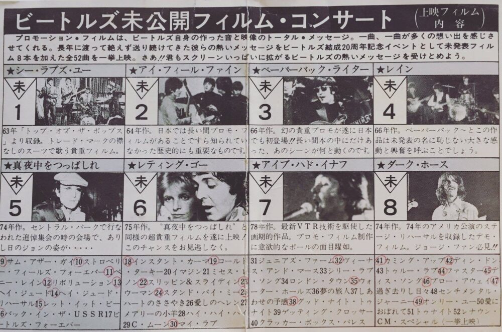 モノ盤リリースの3ヵ月後、中学を卒業し高校の入学を目前に控えた最後の春休み、コンプリート・ビートルズ・ファンクラブ主催の「ビートルズ未公開フィルムコンサート」に出かけた。4月4日の日曜日、場所は四谷公会堂。ファンクラブが入手した「シー・ラブス・ユー」「アイ・フィール・ファイン」「ペーパーバック・ライター」「レイン」、ジョン「真夜中を突っ走れ」、ポール「ワインカラーの少女」「アイブ・ハド・イナフ」、ジョージ「ダーク・ホース」の未公開フィルムに既公開の44本を加えた計52曲のプロモーションフィルムを一挙に公開するというもの。今となっては特段驚く映像はないが、当時の自分にとっては未見のものばかり。デザインが秀逸の告知はがきが届いた段階から大興奮し、妄想を巡らせた。「アイ・フィール・ファイン」「ペーパーバック・ライター」「ストロベリーフィールズ」「ペニーレイン」……。その後何度も劣悪な画質のブートビデオ、ブートDVDの購入を繰り返し、最終的に高画質な正規Blu-rayで入手する映像を最初に観た日という意味でも思い出の一日といえる。