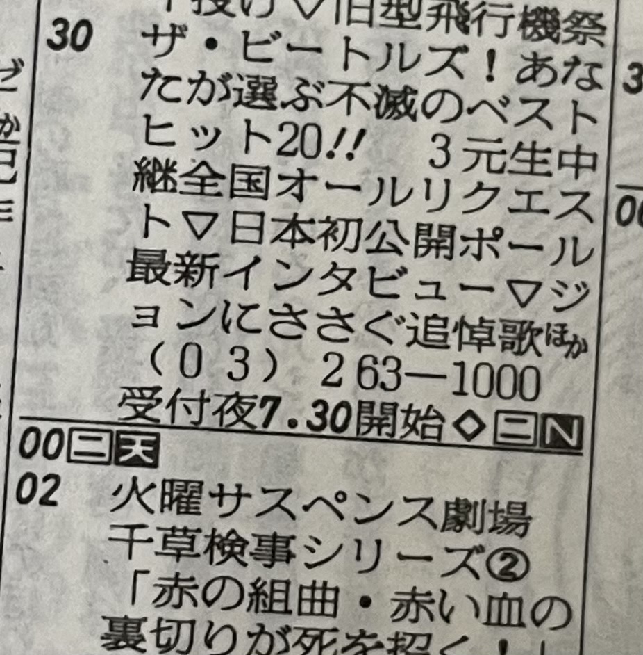 余談だが、その前日だったか2日前だったか、コンプリート・ビートルズ・ファンクラブから電話があり、この番組にギャラリーとして参加してもらえないかと依頼された。公開生放送の会場となるスタジオアルタに来て番組を盛り上げてくれないかという。行きたいとも思ったが、気乗りせず断ってしまった。確かに番組を見ると、客席が映っていて、自分もあの一部になったのかと思ったりした。