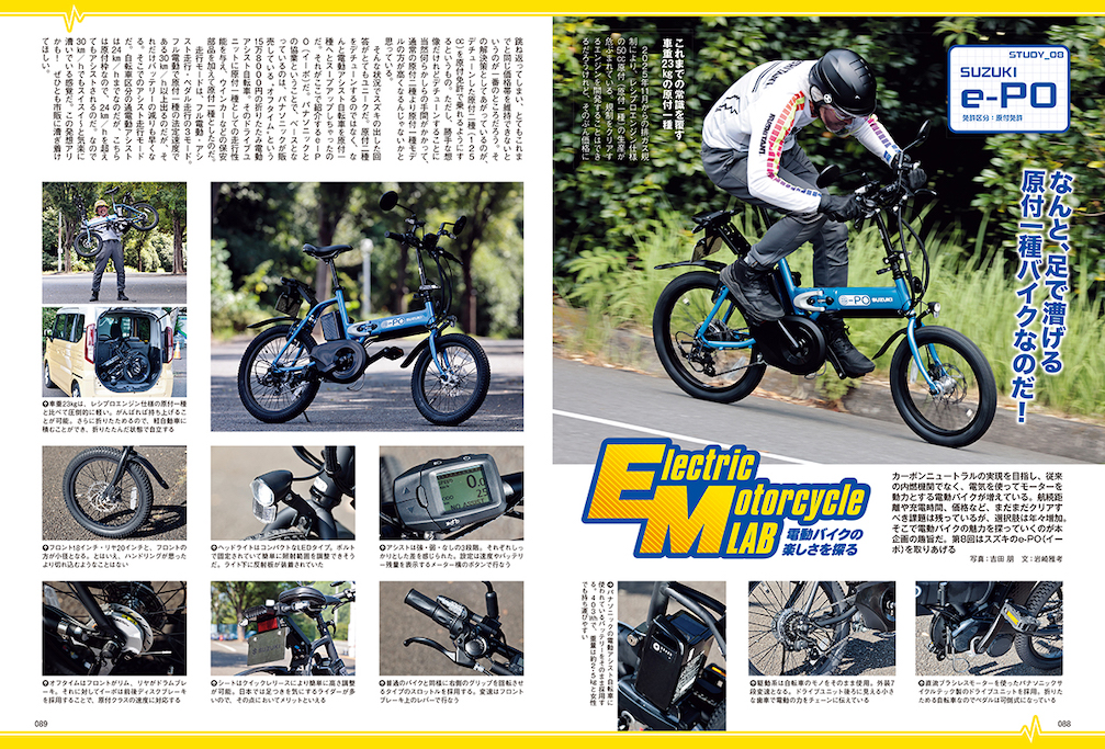 カーボンニュートラルの実現を目指し、従来の内燃機関でなく、電気を使ってモーターを動力とする電動バイクが増えている。航続距離や充電時間、価格など、まだまだクリアすべき課題は残っているが、選択肢は年々増加。そこで始めた電動バイクの魅力を探っていく企画だ。今回はスズキの『e-PO(イーポ)』をピックアップ!