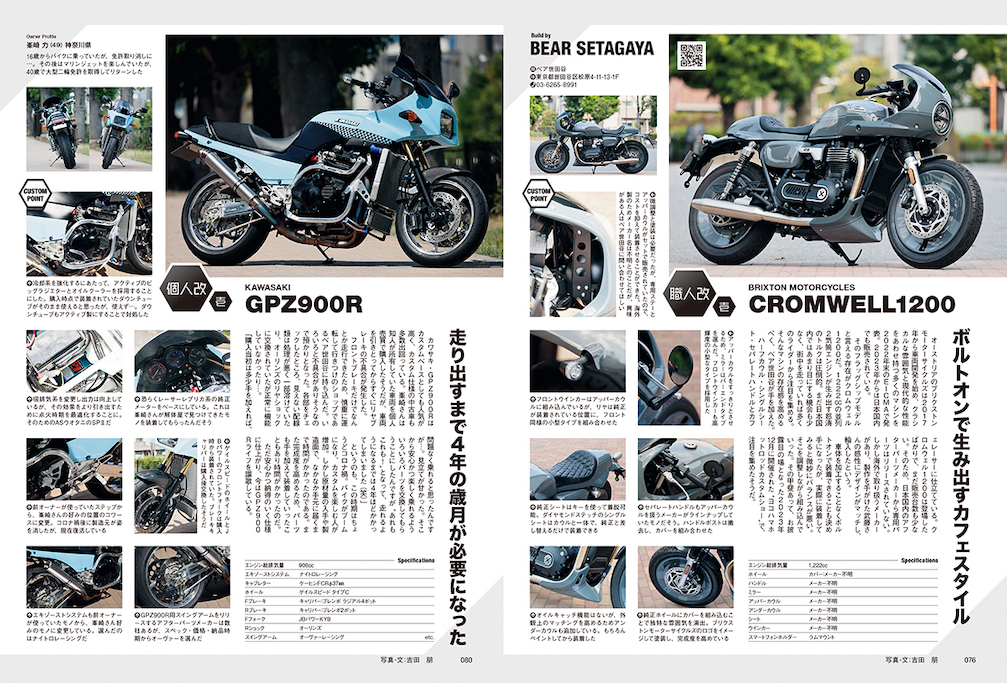 ショップが製作したカスタム車やオーナー自慢のカスタムマシンを紹介し、カスタムのポイントや楽しさを知ってもらう企画。今回紹介する車両はヤマハ・XT250X、カワサキ・Z1R&GPZ900R、ブリクストンモーターサイクルズ・クロムウェル1200、ファンティック・キャバレロスクランブラー500だ。