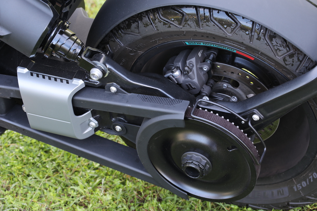 ドライブはベルトで、露出しているところには巻き込み防止のガードが付く。車体左側のみのモノショックタイプで、プリロードのセッティングが可能。