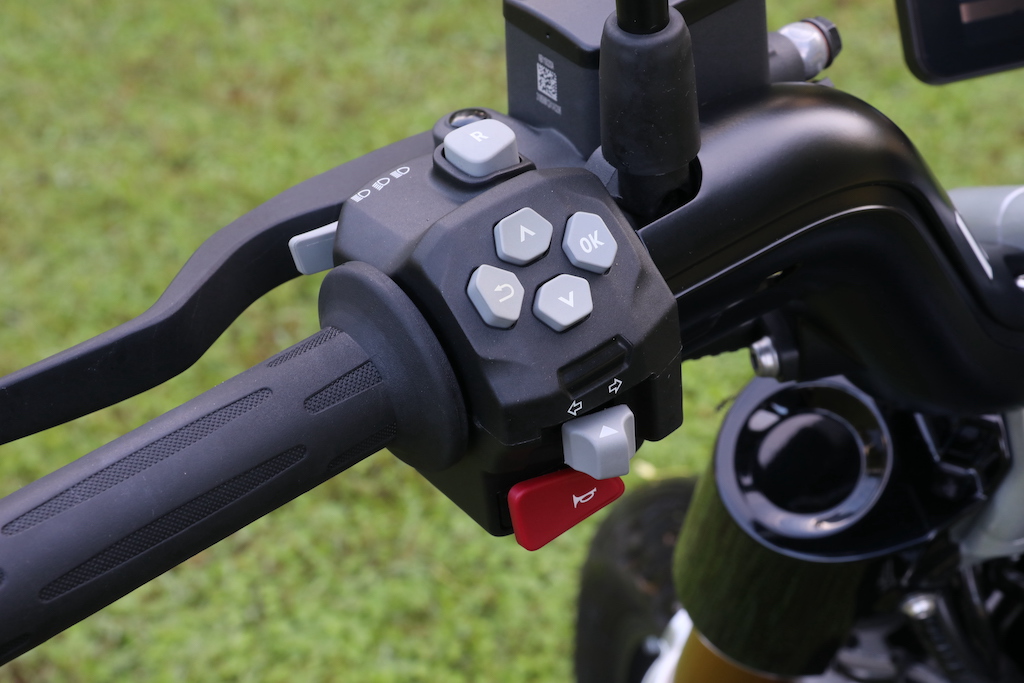 右ハンドルスイッチボックスで主要走行モードが変えられ、左スイッチボックスで細かな設定変更ができる。上側のRボタンで後方に進むこともできるのだ。
