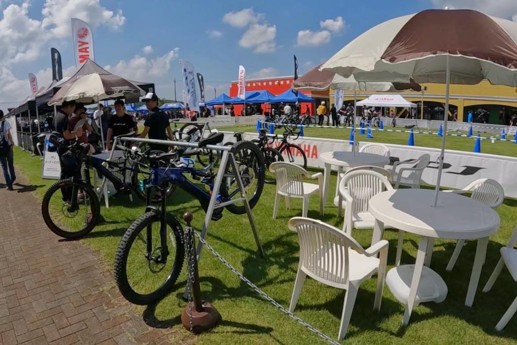 パラソルの下にテーブルとイスが置かれたYPJオーナーのための休憩スペースが設けられていて、愛車で来場したオーナーのためにサイクルラックのある駐輪スペースも確保されていた。
