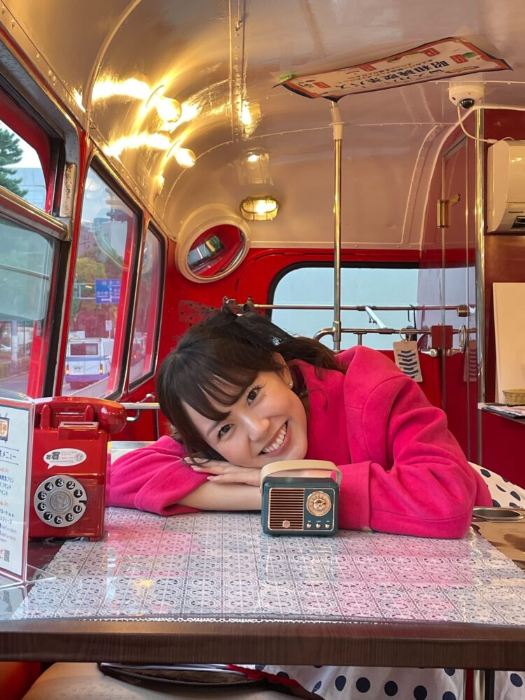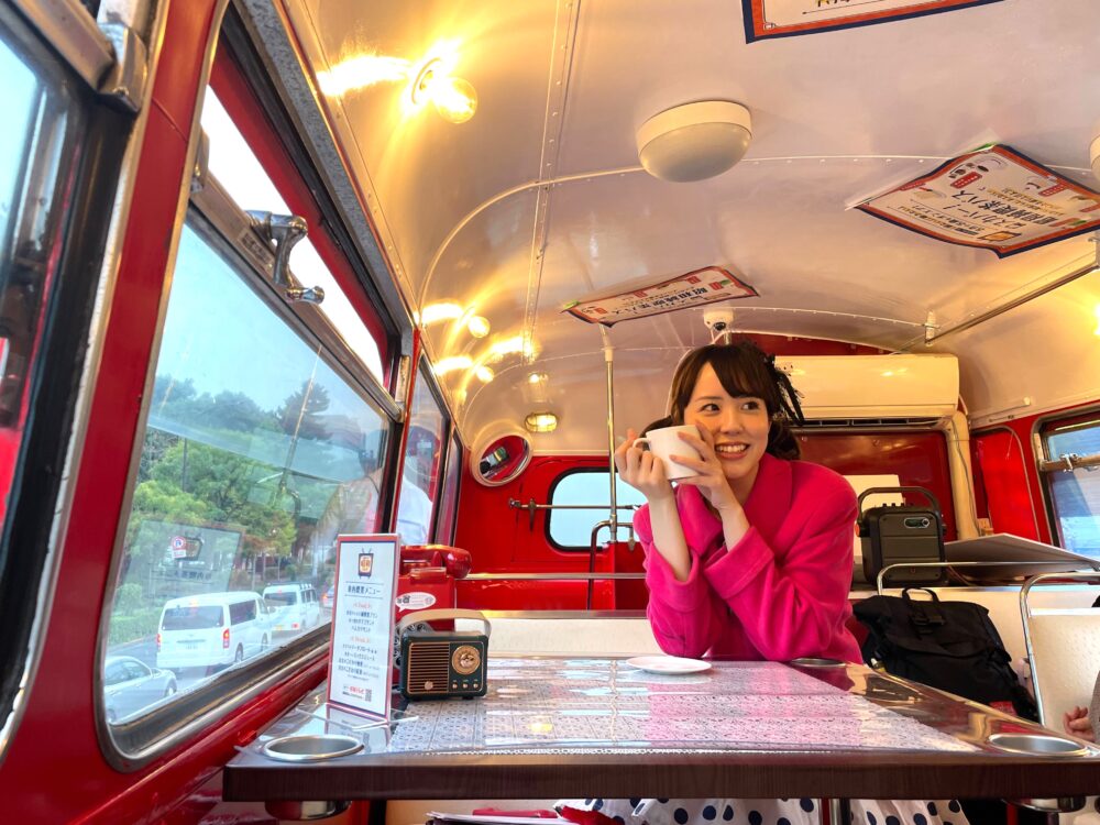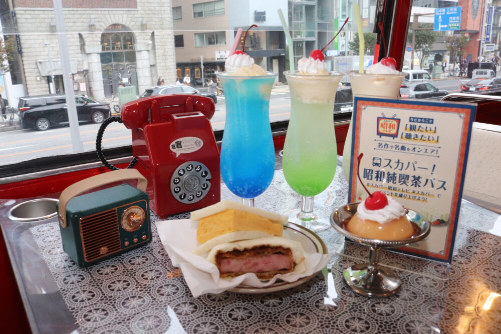 都内を回るなか、バス内では昭和の純喫茶をイメージした特別メニューがふるまわれた。クリームソーダ、ハムカツサンド、たまごサンドにプリンはどれも美味で、舌でも昭和を味わうことができたのは格別にうれしく、皆一様に舌鼓を打った。阪田さんはプリンが特に気に入ったそうで「マリンだけに、とってもうまリン!」とゴキゲンだった。