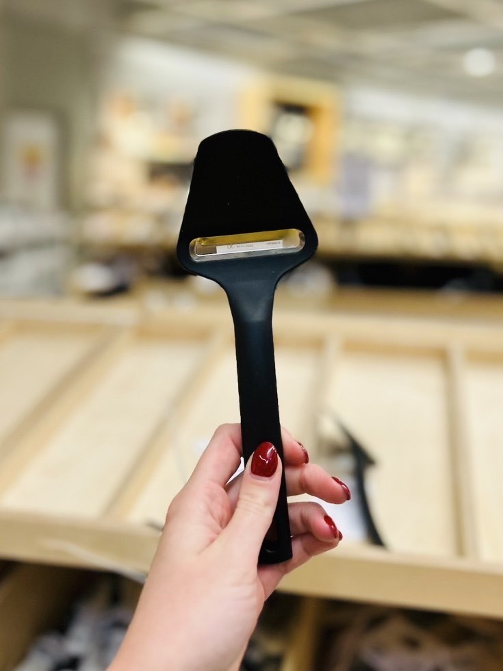 チーズ削り! スウェーデン語ではOsthyvel (オスツヒーヴェル)。確かにわたしはホームパーティでこれを食卓に出しますが、日本人はこれでチーズをカットしようとしますね。違います。削るんです。日本でも最近は大きめのチーズの塊が売ってますが、本当はこれで削ってパンに乗せます。日本でも広めてほしいです!