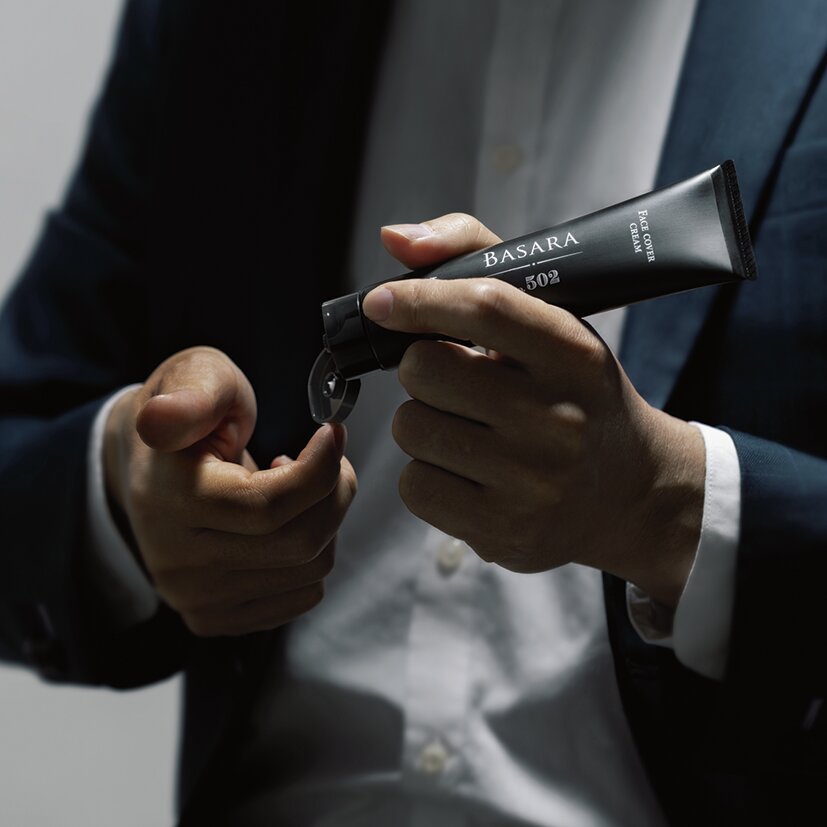 メイクまではしたくないけど、肌をキレイに見せたいと思っている男性は多い。そんなときに便利なバサラのフェイスカバークリーム。無色のクリームは肌タイプを問わず、男性特有の悩みに対応してくれるので、難しい色選びが不要なのもうれしい。