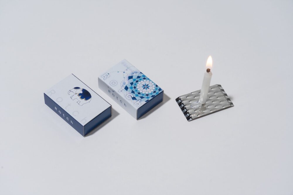 「九谷焼エディション」のローソクと燭台のパッケージには、早助千晴さんが書き下ろした図案をはじめ、数々の作品に登場する白い象が描かれている。通常は赤いローソクの頭薬も、特別に紺青をイメージした色味で制作。