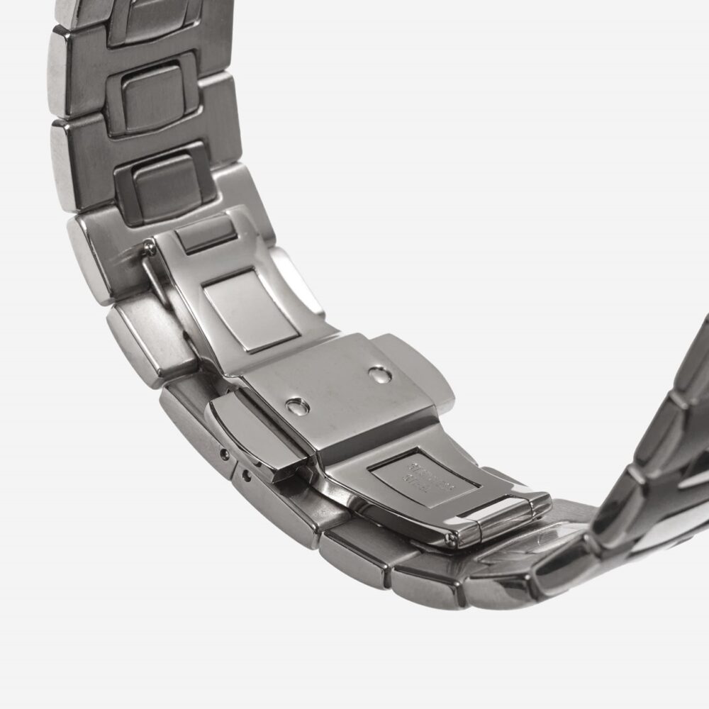 メインリンクにはブラスト加工を施し、洗練されたマットな質感を実現。一方で、内側のリンクは高光沢のポリッシュ仕上げが施されており、輝きと奥行きを演出。この異なる質感の組み合わせが、視覚的なバランスを生み出し、デザイン全体の強さと優雅さを一層引き立ててくれる。