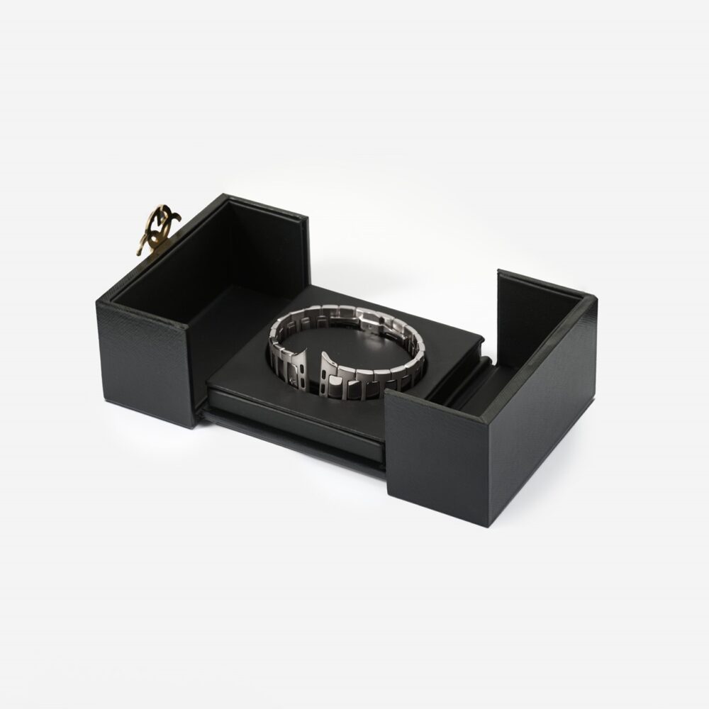 製品は、内装にブラックレザーを用いたハンドメイドのブラックオーク製ボックスに収められます。商品の魅力を最大限に引き出すために、開封構造にも工夫を凝らし、慎重にデザイン。単なる包装物に留まらず、贅沢で魅力的な”開封体験”をお届けする。
