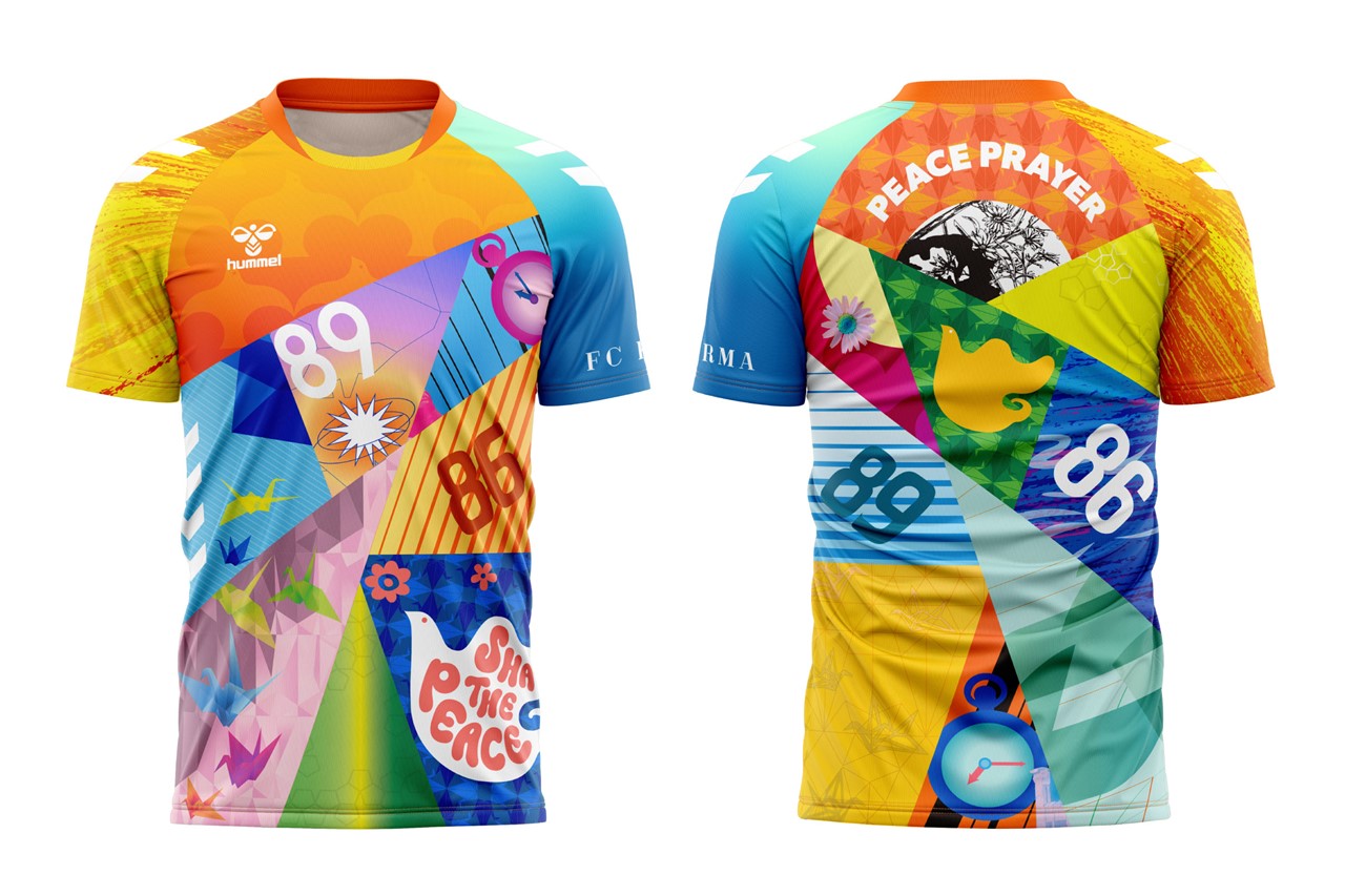 今回、ピースユニフォームとピーススニーカーのデザインを合わせた12種類のデザインを混ぜ合わせ(マッシュアップ)、縫い合わせたようなデザインにしたピースユニフォームを発表。これからも平和の想いを繋いでいくという意思を込めて、たすき掛けデザインのユニフォームに仕上げた。