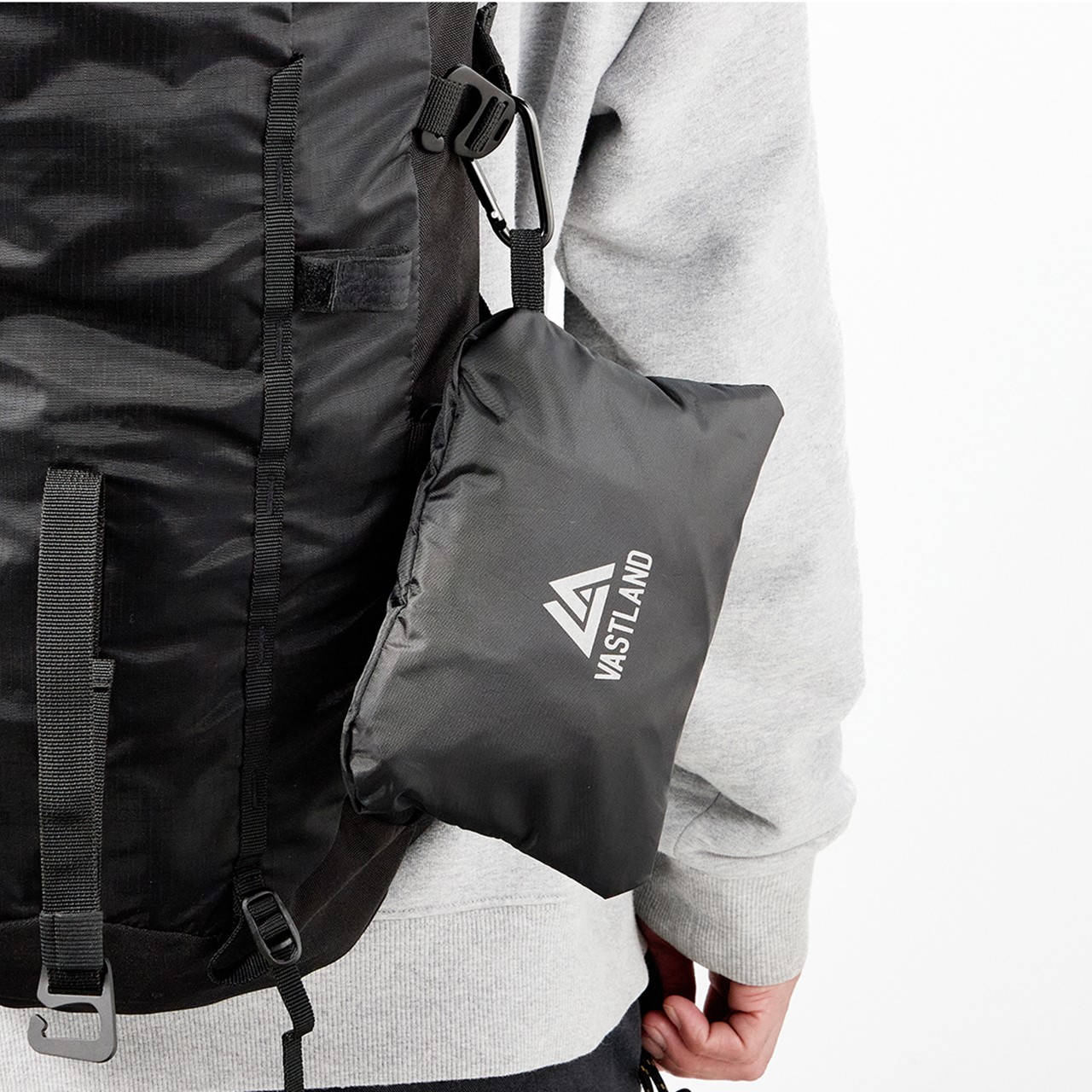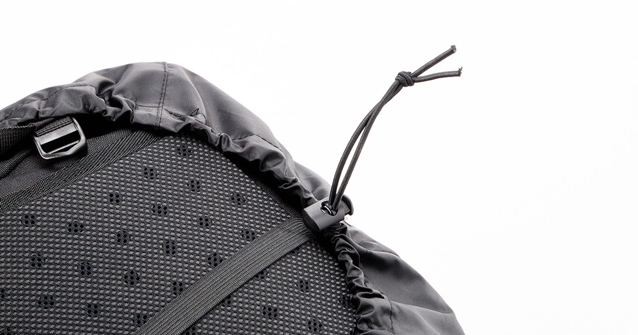 装着方法はリュックに被せた後、長さ調整ができる縦横2本のベルトで固定するだけ。さらにドローコードが付いており、ストッパーで絞りの強さの微調整が可能なため、ズレを防ぎしっかりとリュックにフィットする。