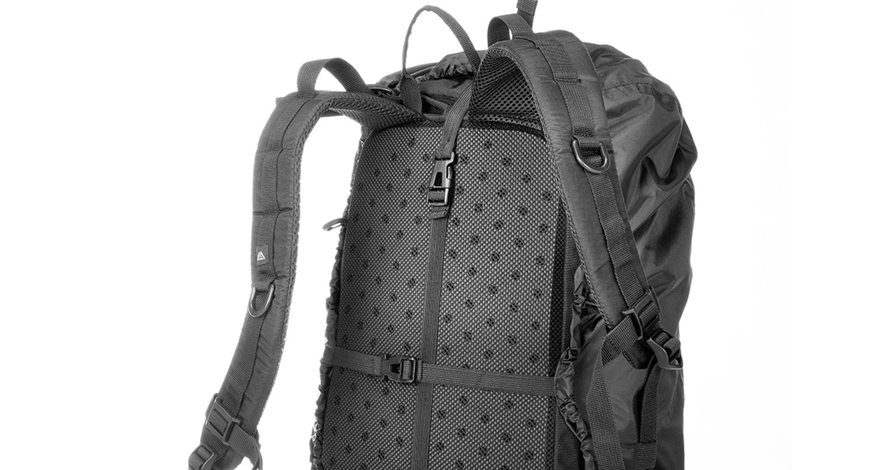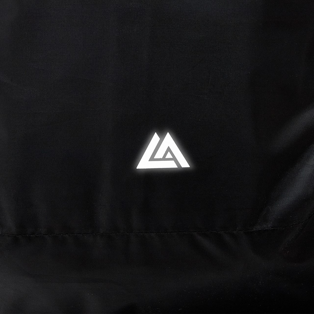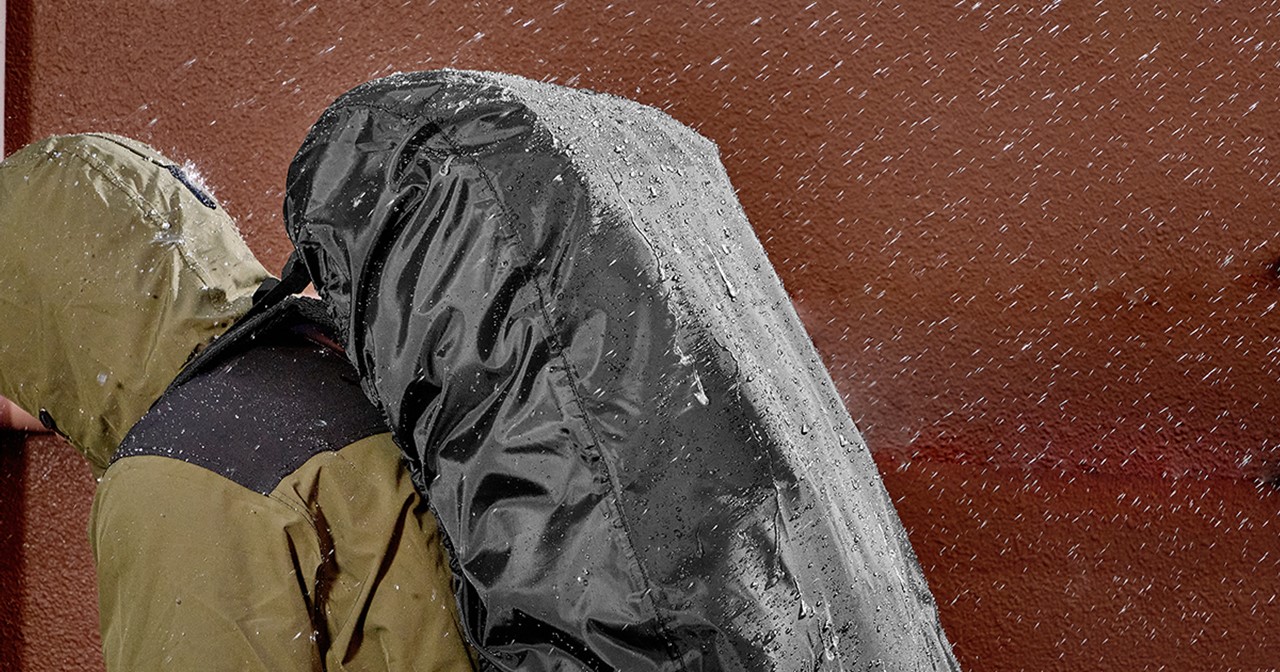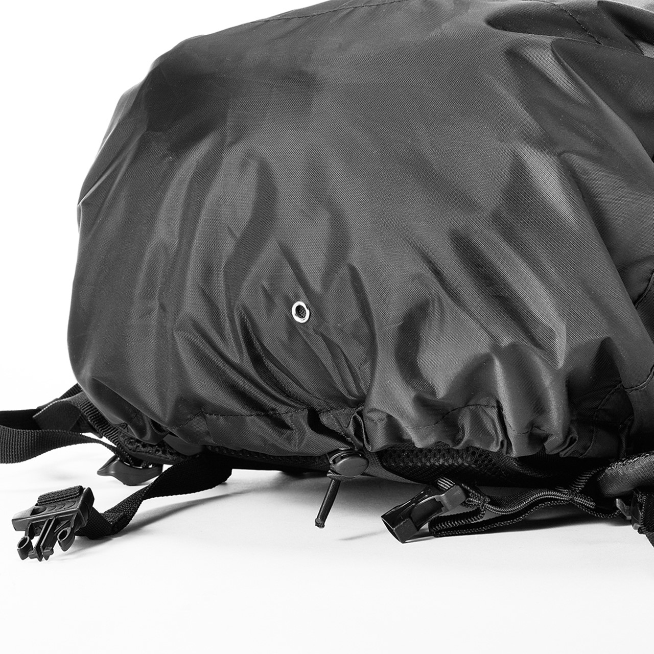 本商品の素材は210DポリエステルにPUコーティングを施しており、耐水圧は5,000mm。一般的に傘の耐水圧が250mmのため、小雨や小雪を凌ぐ程度であれば十分な耐水圧と言える。さらに撥水加工を施すことで、防水性を高めリュックへの浸水をブロックする。(国内の第三者機関にて、耐水性試験・撥水性試験を実施済)