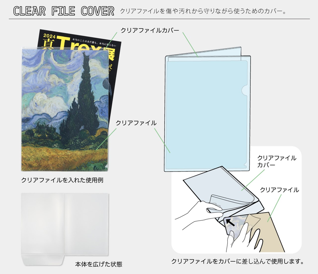 美術館や博物館(映画館)など商業施設やイベント会場で購入した“お気に入り”のクリアファイルを保護しながら使用するためのカバー。映画、美術館、博物館のグッズとして定番のクリアファイルだが、“使わない”ものとして購入する人も多い。自身が購入したもの以外でも、商品購入特典やノベルティなど、クリアファイルは公式グッズの定番品でもある。そうして入手したファイルは思い入れが強く「使うのが勿体無い」という声も多く、中には保存用と使用分とで2枚購入される人、汚れることや傷つくことを恐れて“購入しない”といった声もある。そこで、今までにはなかった、お気に入りのクリアファイルを傷や汚れから守りながら使えるクリアファイル専用のカバーを商品化した。