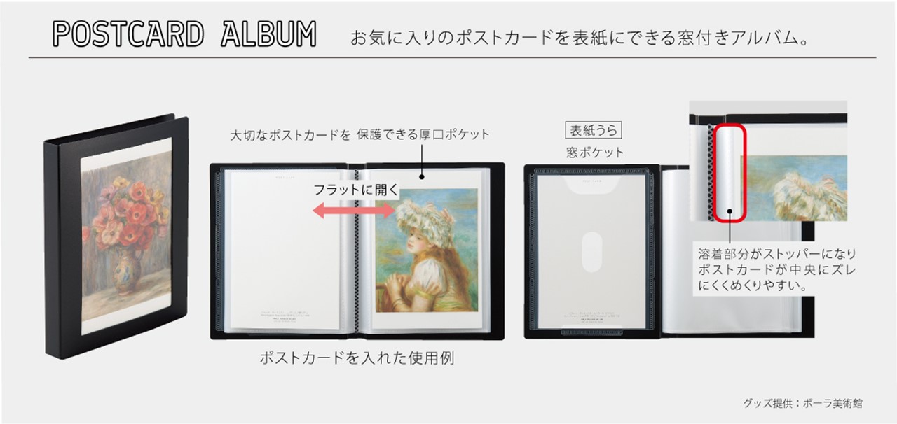 お気に入りのポストカードを表紙にできる窓付きアルバム。美術館や博物館などの展覧会、映画館、アーティストのグッズとしてポストカードは多く販売されており、購入してコレクションしている方も多いジャンルだ。しかし、市場にあるハガキ収納製品は年賀状を入れるような事務品感が強いものが多いため、今回コレクター向けにシンプルなデザインで商品化したのがこちら。お気に入りのポストカードを表紙にすることでお好みの表紙にして楽しむことができる。ハガキサイズ(100×148mm)とA6サイズ(105×148mm)どちらのサイズも収容可能である。