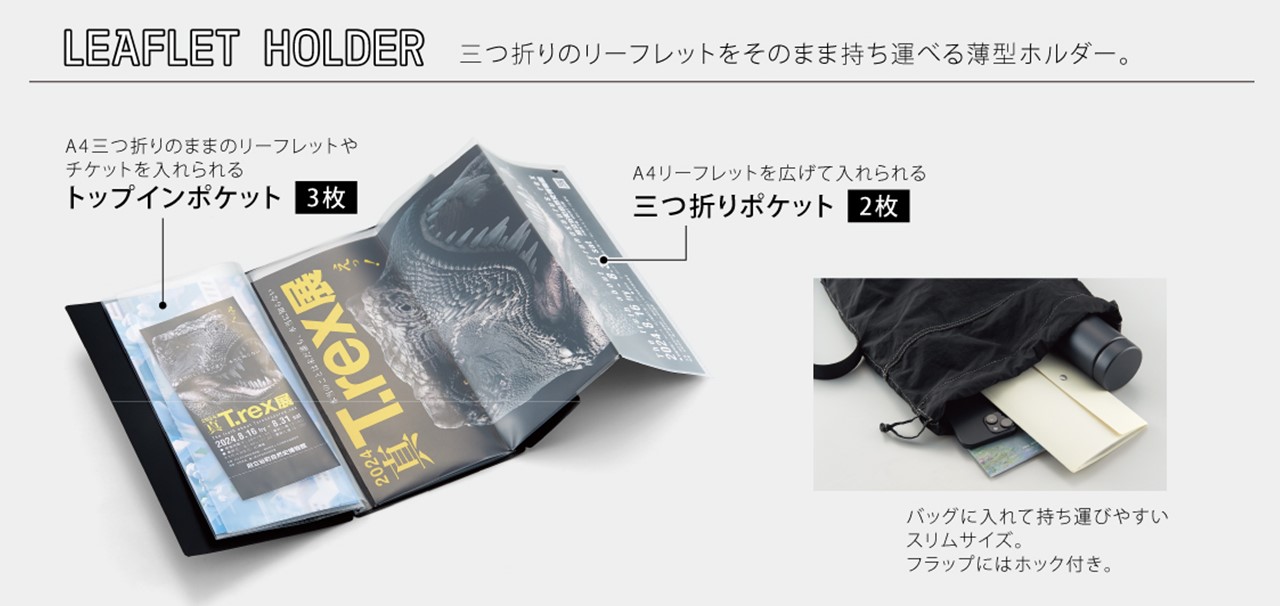 博物館や観光地などで配布されているA4三つ折りサイズのリーフレットやチケットを持ち運べる薄型ホルダー。A4サイズのパンフレットを三つ折りにしてコンパクトに持ち歩くことができるポケット2枚付いた仕様。フラップにはホック付きでバッグに入れて持ち運びしやすいスリムサイズの商品となっている。
