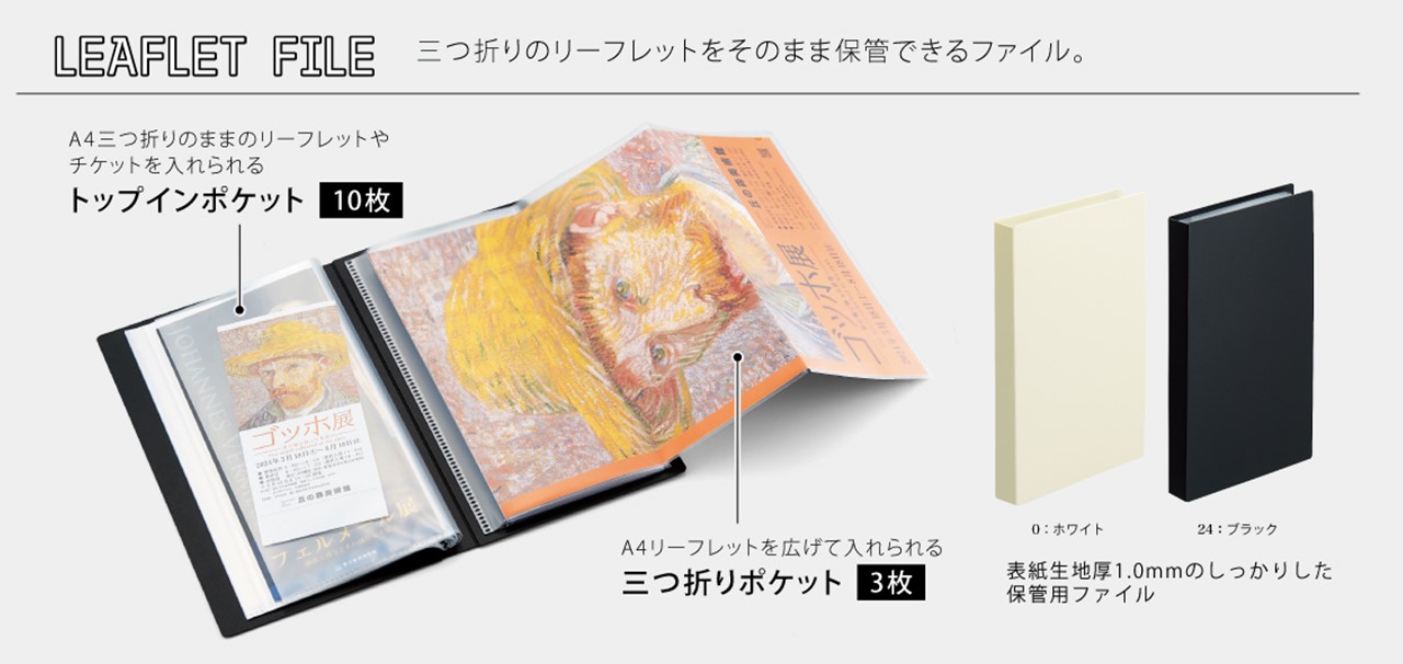 A4三つ折りのリーフレットやミニ冊子などをそのまま保管できるファイル。持ち運びに便利なスリムタイプの「リーフレットホルダー」に対して、ポケット数を増やした保管用のシンプルな「リーフレットファイル」も合わせて商品化した。