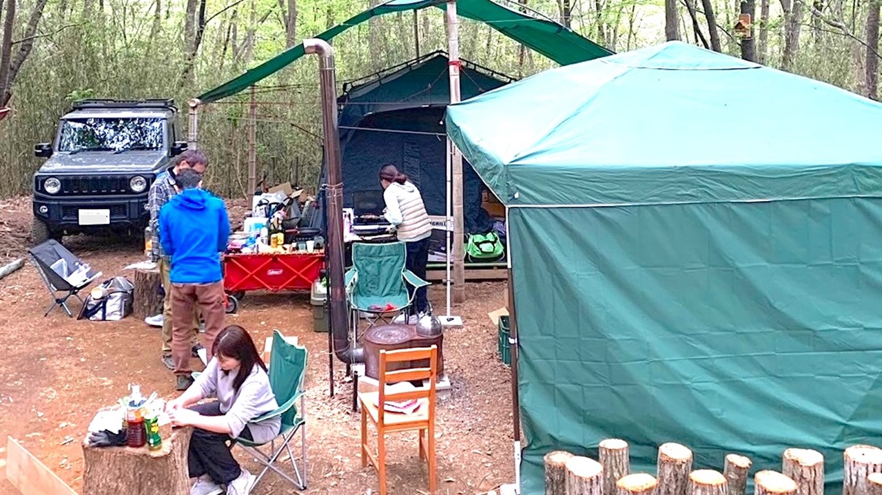 嵐山キャンプエリアは、埼玉県の中央に位置しており、都心から約80分でアクセスできる。ここでは、365日いつでも自分だけの森林空間を手に入れることができる。近くにはコンビニが車で3分の距離にあり、15分圏内にはスーパーや入浴施設が複数存在しているため、静かな里山でありながら利便性の良いエリアとなっている。