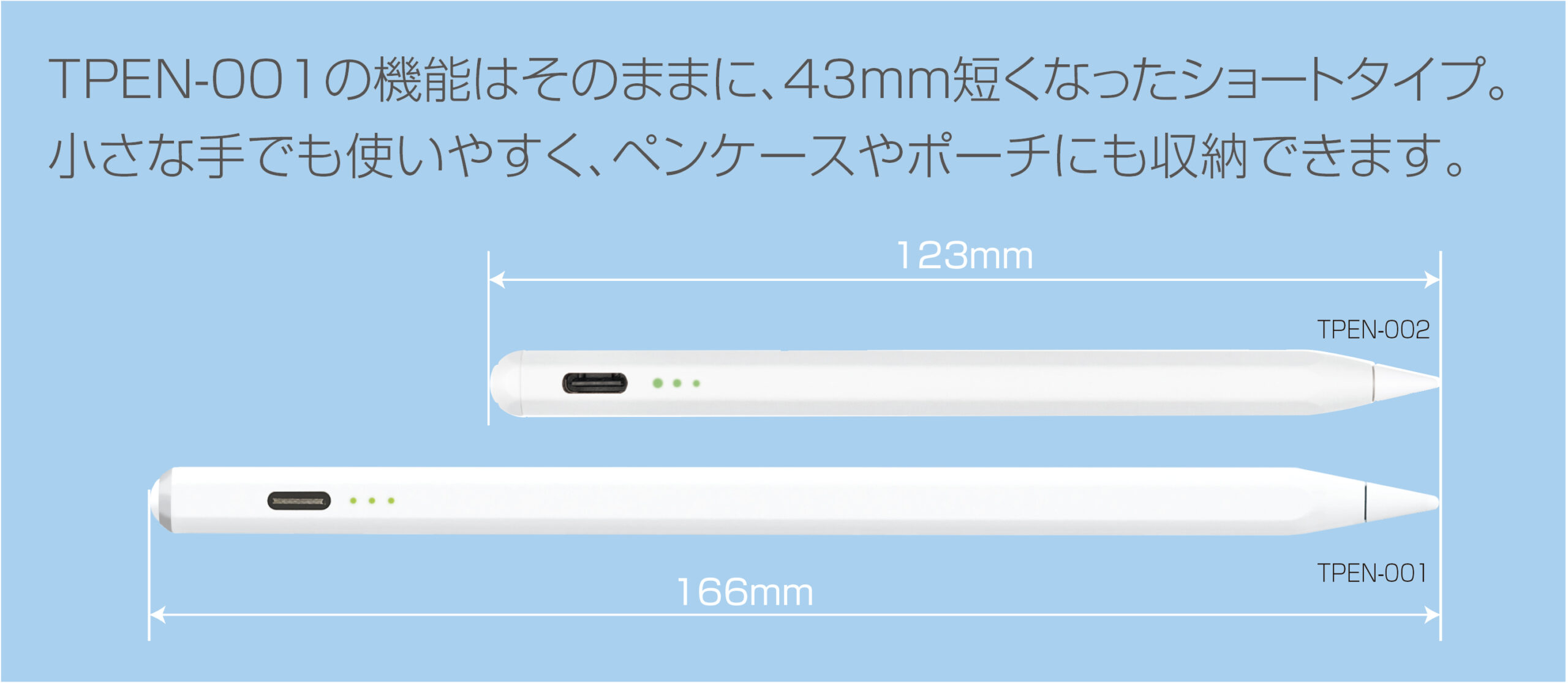 「iPad専用充電式タッチペン ショートタイプ」は細かな文字やイラストが描きやすく、手の平に収まるサイズ感の高感度極細ペン先のタッチペン。すでに販売されている「iPad専用充電式タッチペン(TPEN-001)」の機能はそのままに、全長が43mm短くなった。短くなったことで小さな手でも使いやすく、ペンケースやポーチへの収納も可能となった。