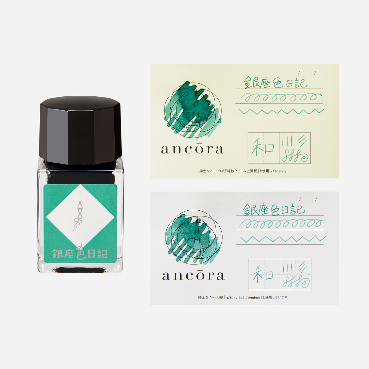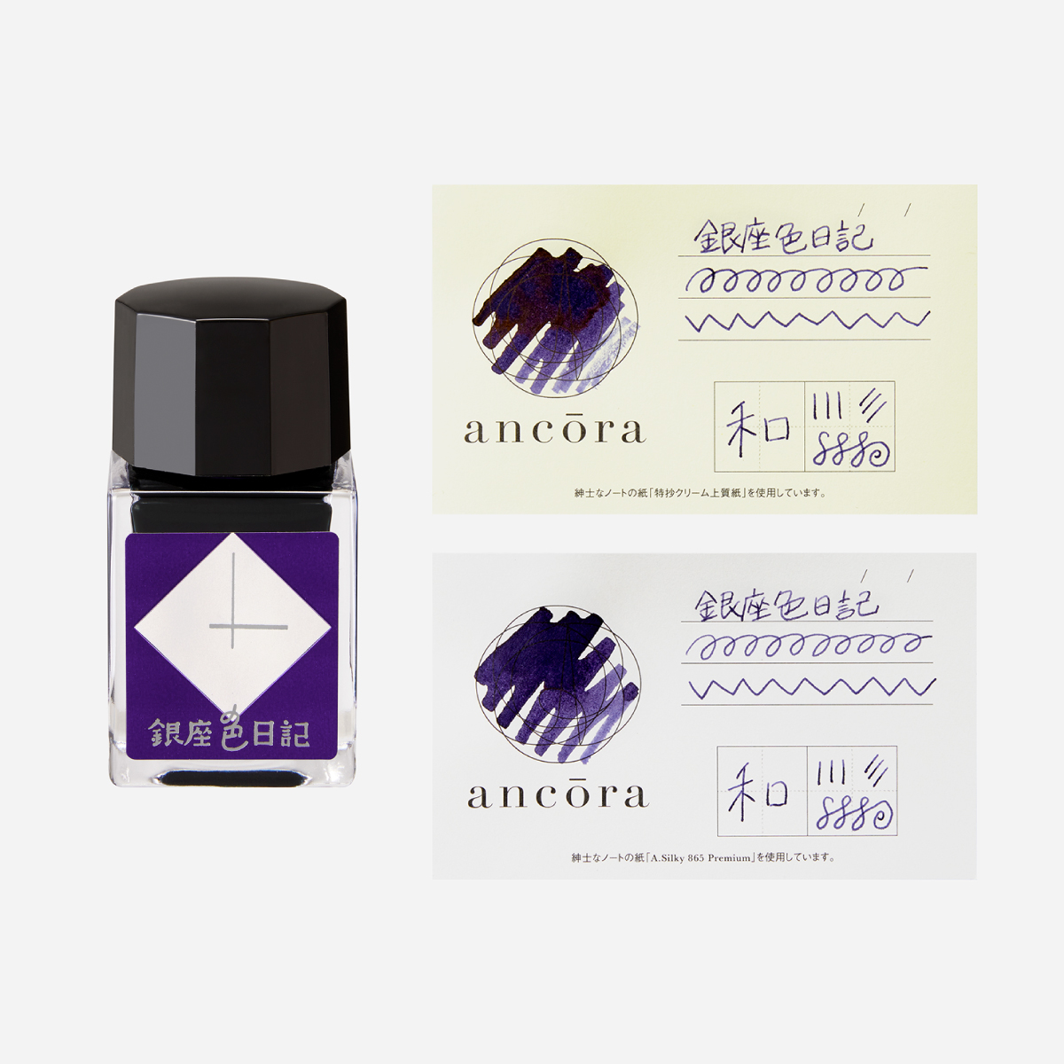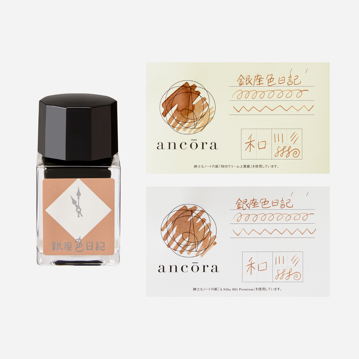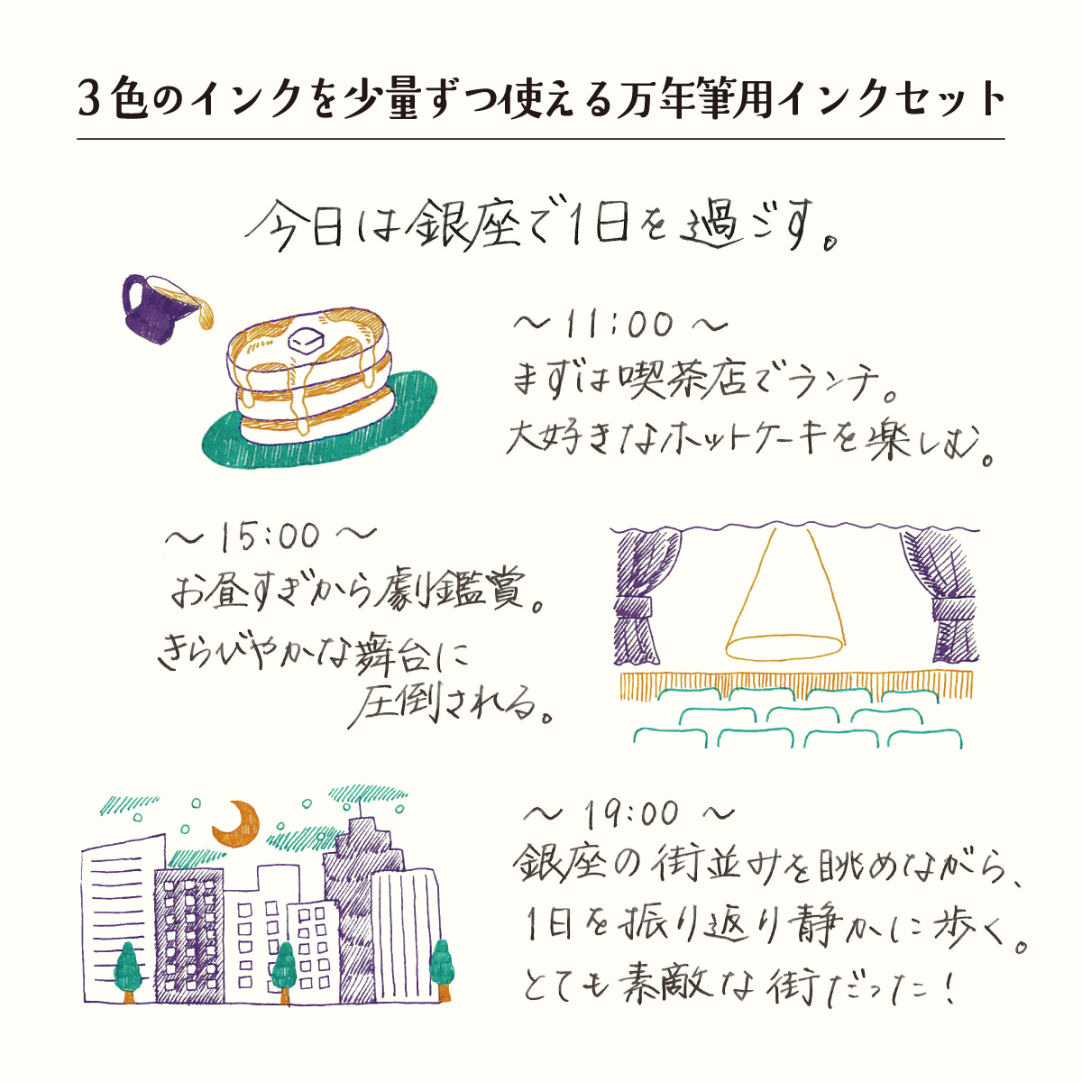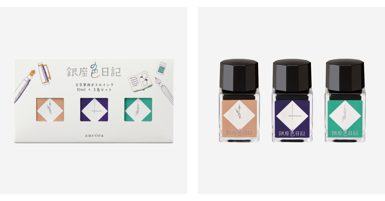 アンコーラ限定の万年筆用ボトルインクセットとして、新たにラインアップした「銀座色日記」は、使いやすい10mlボトルの3色セット。インクカラーは、銀座で過ごす1日を「11:00(オレンジ)」、「15:00(パープル)」「19:00(グリーン)」の3色で表現している。