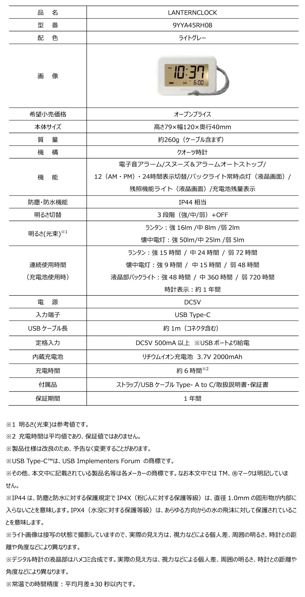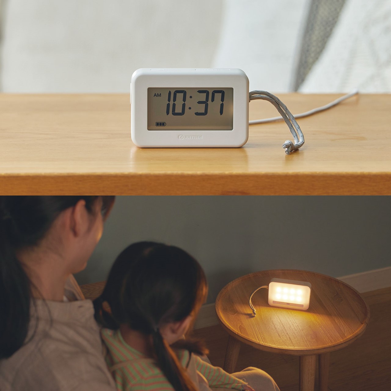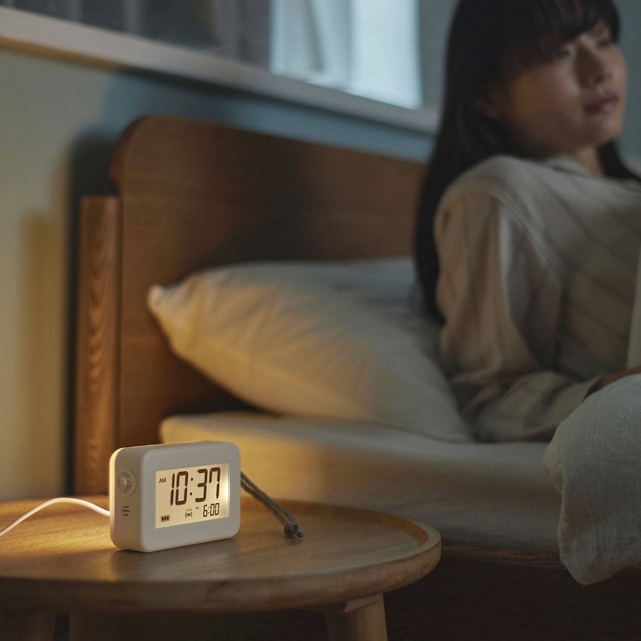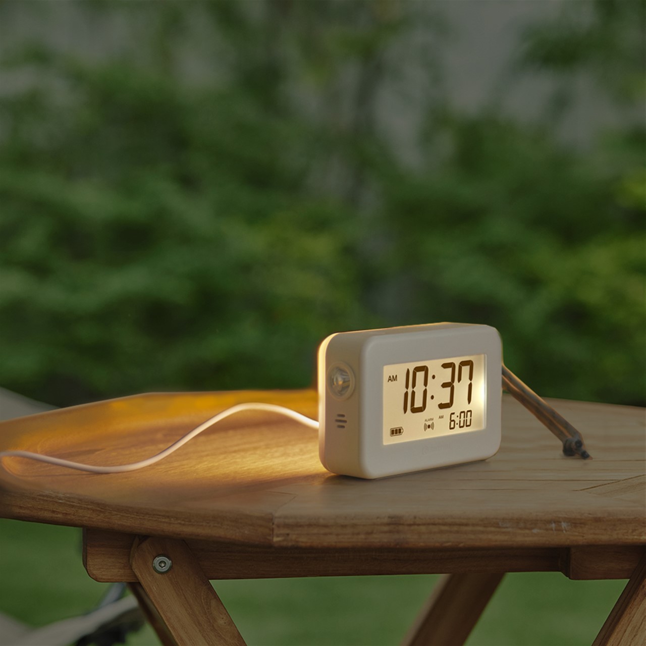 液晶画面は3段階の明るさが調節でき、昼夜を問わず時刻が見やすく、寝室などで活躍する。目覚まし機能付きで、アラーム音とともにランタンが強点灯で灯り、起きる時間を知らせてくれる。