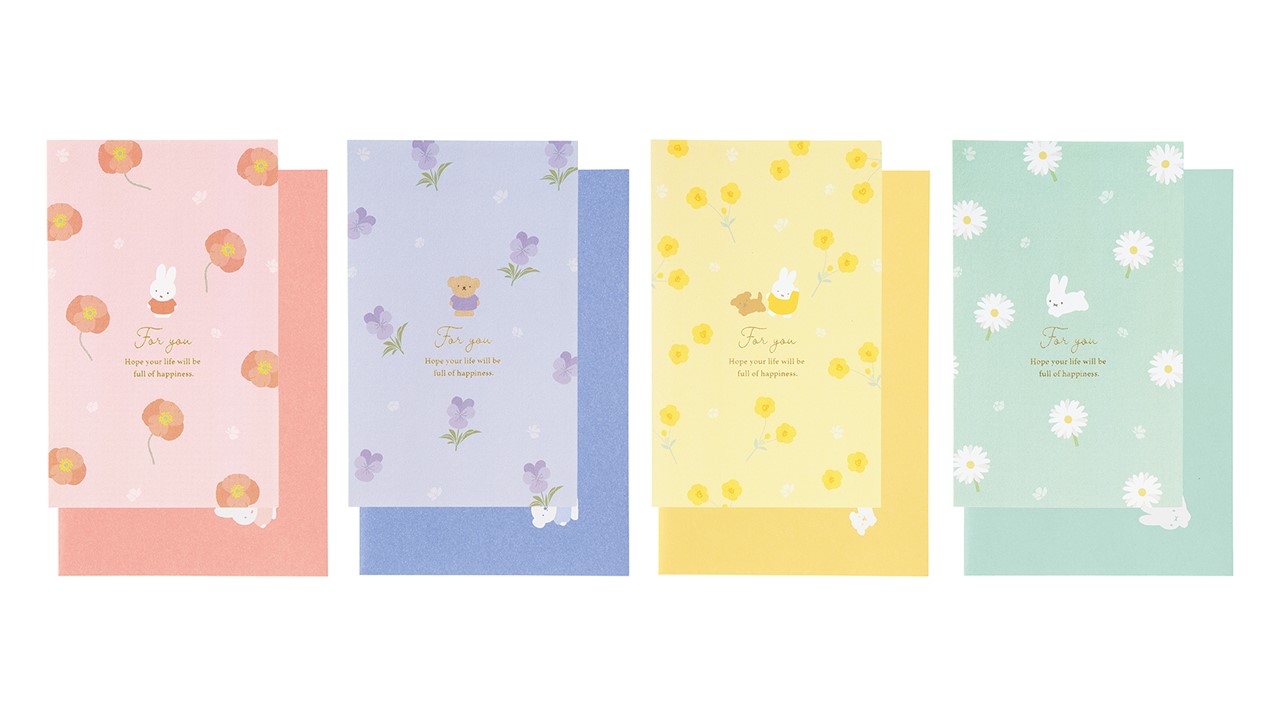 価格:330円(税込)/種類:4種(ミッフィー・ボリス・スナッフィー・うさぎ)/製品寸法:二つ折カードW85×H135mm、封筒W98×H148mm/内容:カード1枚、封筒1枚、無地の添紙1枚
