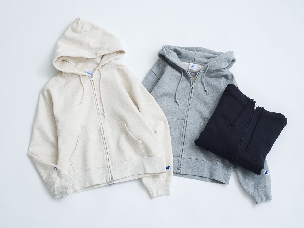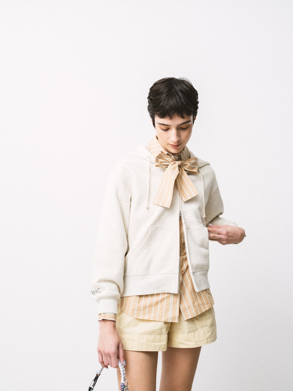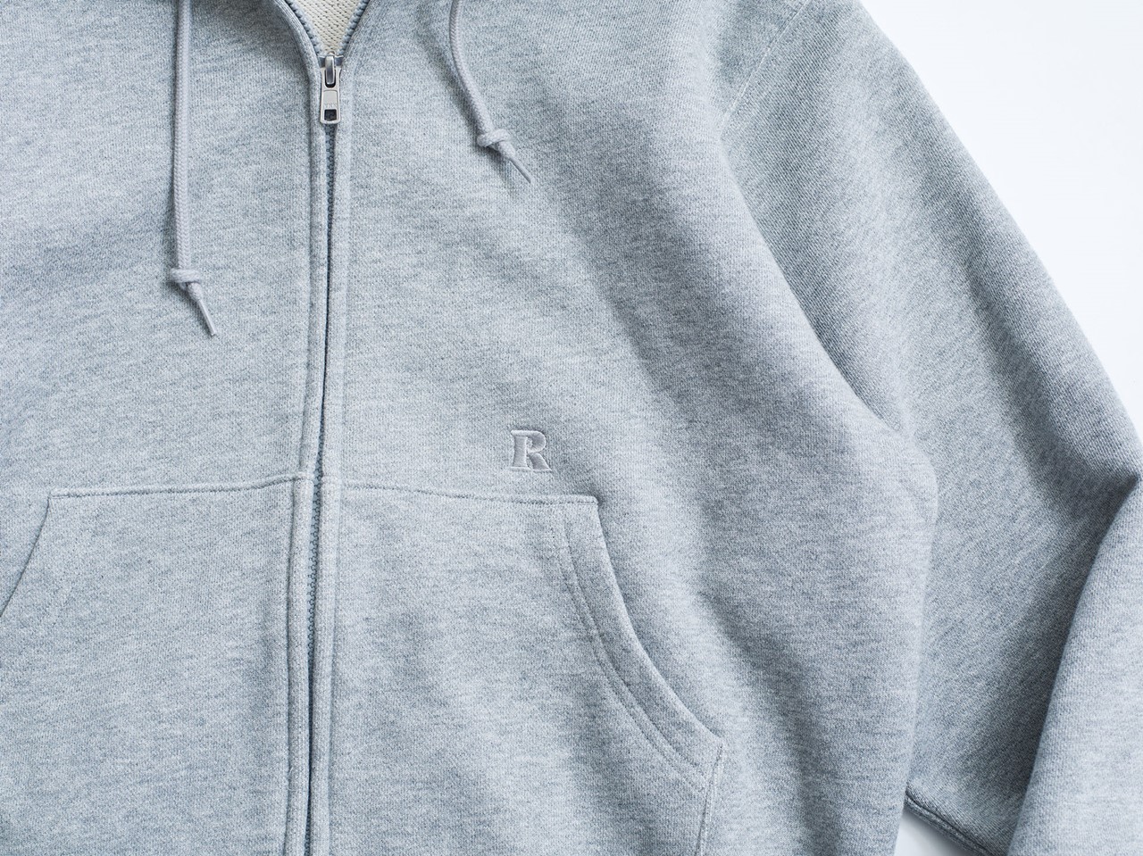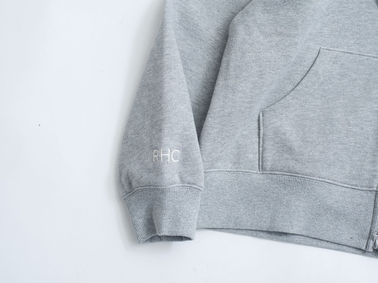 季節の変わり目に重宝するフルジップフーディ。ワードローブに欠かせないアイボリー・グレー・ブラックの3色展開。着丈を程よく短くし、コンパクトなシルエットに仕上げた。フロント部分と袖元に施された「R」と「RHC」のロゴがポイント。